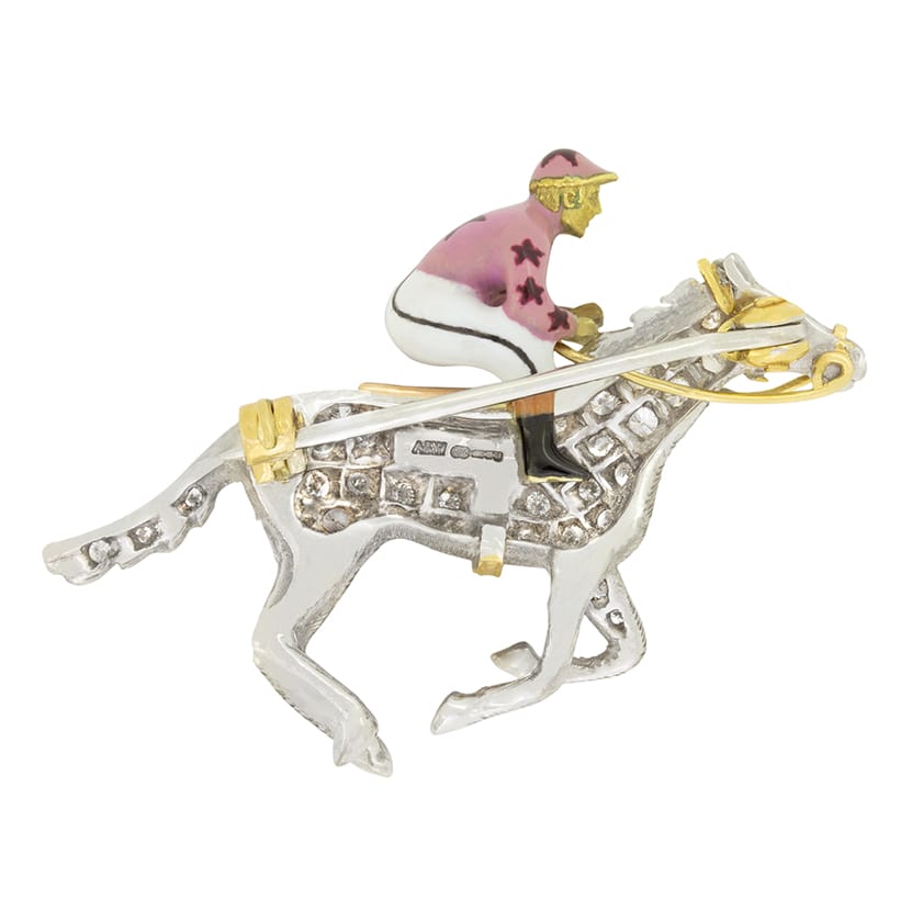 Beautifully made in 18 carat white gold, this brooch depicts a horse and jockey in full gallop. A total of 0.35 carat in round brilliant diamonds are set across the horse’s body. Each diamond matches in quality at G in colour and VS2 in clarity. The jockey is enamelled and impeccably detailed. The tail, reins and saddle of the horse are made in 18 carat yellow gold, along with the face of the jockey.