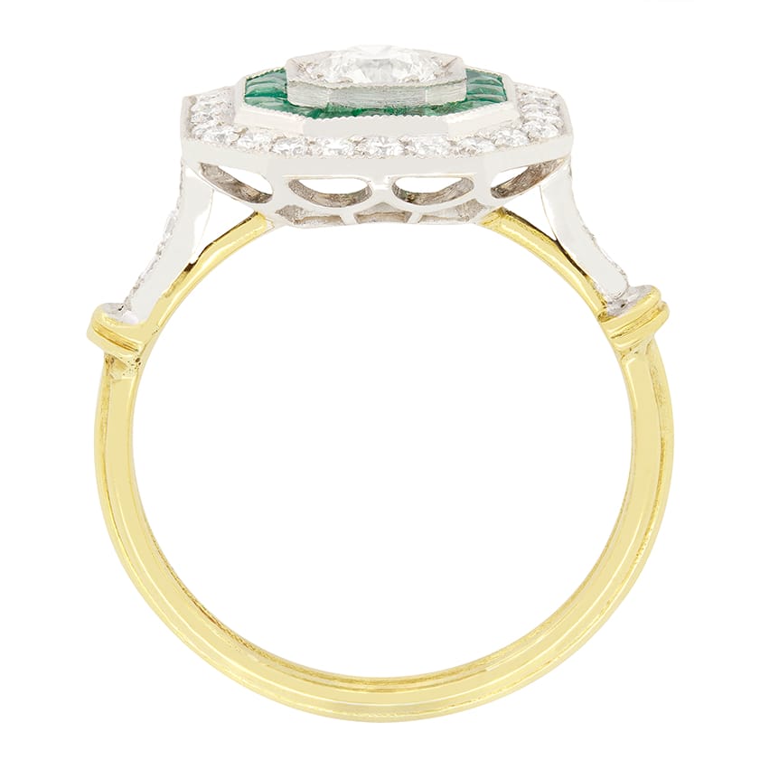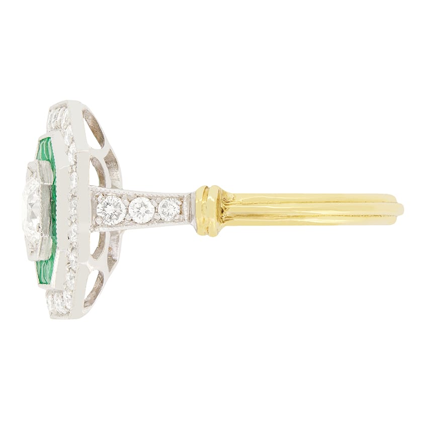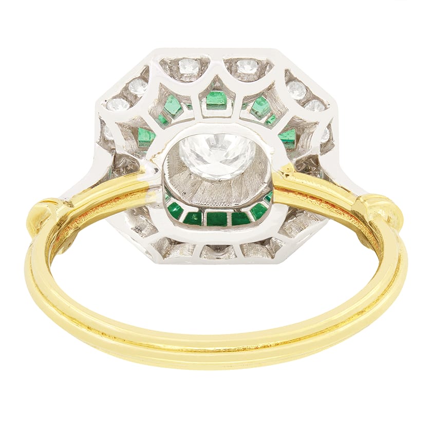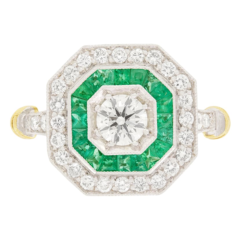 This stunning Vintage target ring is a true beauty. At the centre, a 0.40 carat round brilliant diamond, is held in a secure claw setting. Surrounding the diamond is a mesmerizing halo of vibrant emeralds, totalling 0.60 carats, creating a rich pop of green that contrasts beautifully with the brilliance of the diamonds. The outer halo sparkles with 0.24 carats of round brilliant cut diamonds which flow along the shoulders to further 0.12 carats of diamonds. All the stones used match perfectly in quality at G colour and VS1 clarity. Set in platinum, with an elegant band of 18 carat yellow gold, this ring is full of Vintage charm.