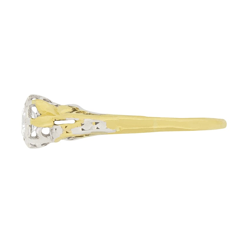 This unique vintage engagement ring makes a statement! A 0.40 carat round brilliant cut diamond is featured, and is an I colour and SI clarity. The diamond is held within platinum claws, and is surrounded by the twisting, branch-like platinum and 18 carat yellow gold shoulders. This ring was made in the 1940s, and has an eclectic charm.