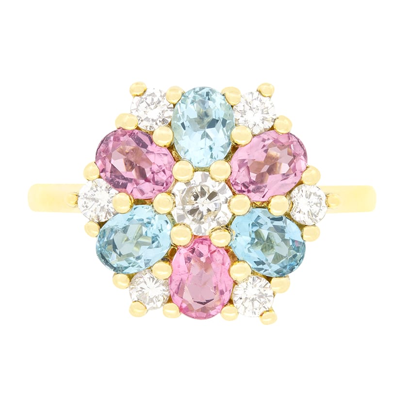 Vintage 0.45ct Diamond, Aquamarine and Pink Sapphire Cluster Ring, c.1990s