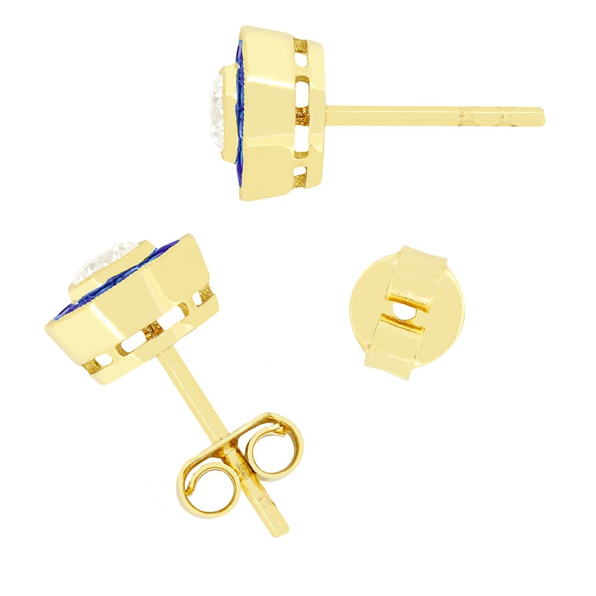 Dating to the 1980s, wonderful pair of earrings centre around two sparkling round brilliant diamonds. These diamonds sit at 0.25 carat a piece, rub over set into 18 carat yellow gold. Creating a target design, each diamond is then surrounding by a ring of intense blue sapphires totalling 0.52 carat. A simple post and butterfly back fitting keeps the earrings safely on the ear.