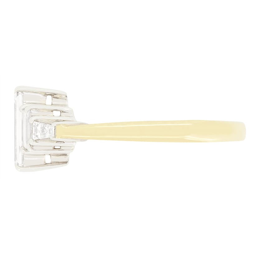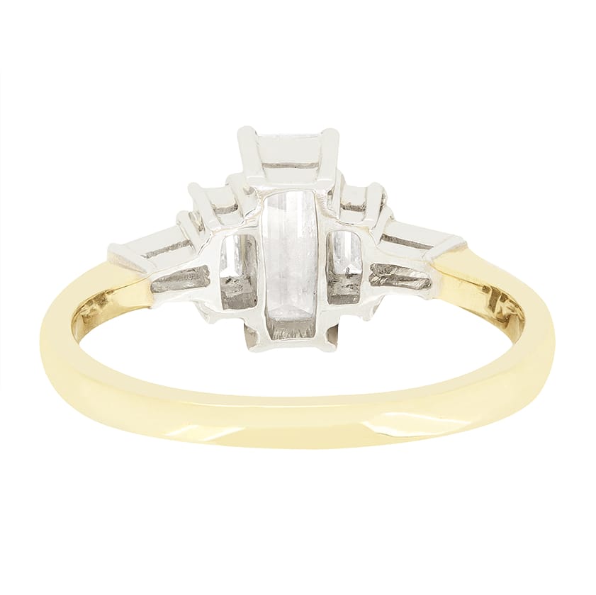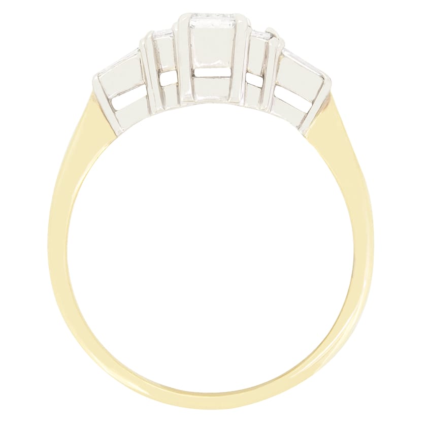 Dating to the 1960s, this beautiful five stone ring features a collection of baguette cut diamonds as the showpiece. The central stone sits the largest at 0.50 carat, with the flanking pair weighing 0.10 carat apiece and two tapered baguette cut diamonds sitting at either end, weighing 0.05 carat each. Each diamond is of matching quality with colour of G and clarity of SI1. The stones are each claw set into 18 carat white gold, with a contrasting band of 18 carat yellow gold completing the piece perfectly.