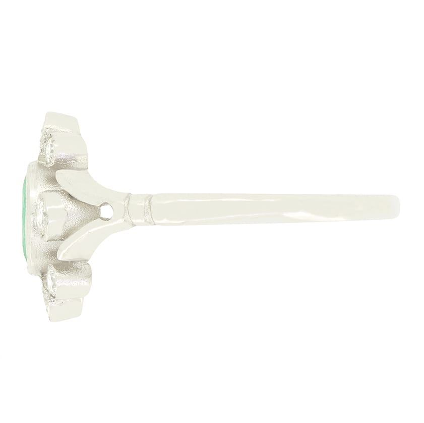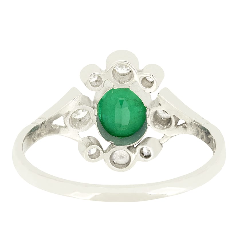 Dating to the 1970s comes this wonderful vintage cluster ring. The piece centres around an oval cut natural emerald weighing 0.50 carat. Surrounding this emerald, a collection of sparkling round brilliant diamonds sit, each in its own rub over set collet. Totalling 0.52 carat these diamonds match in quality at H in colour and VS in clarity. The ring itself is crafted in platinum, creating a beautiful, clean look.