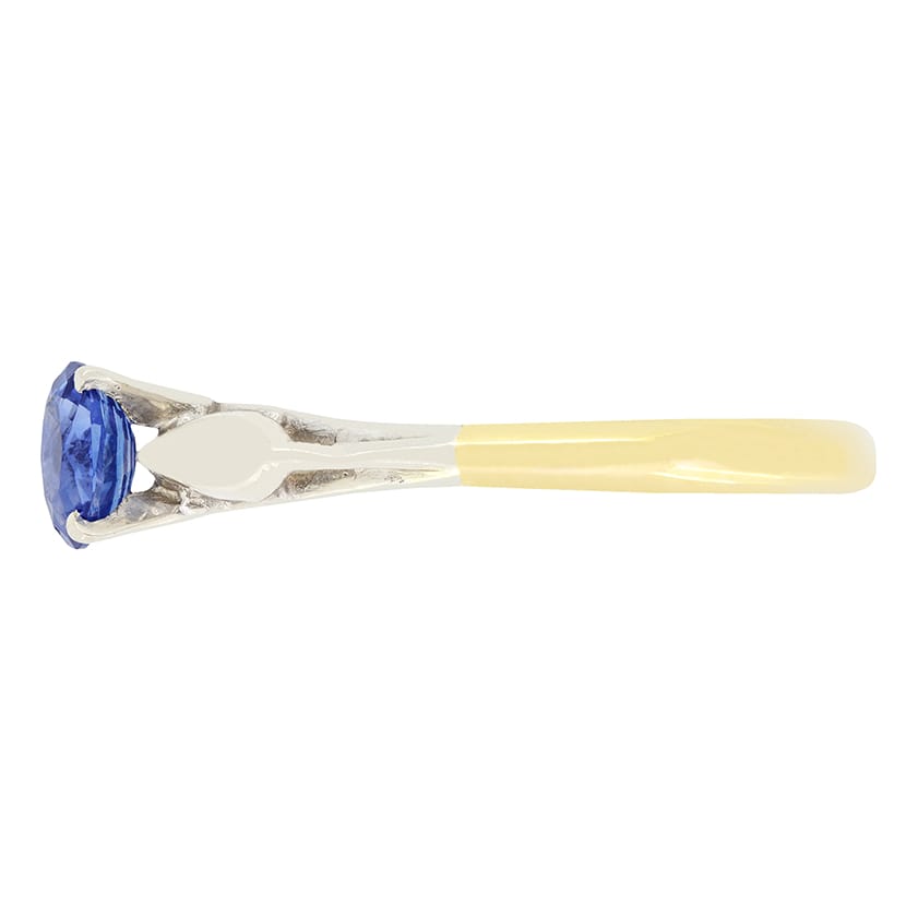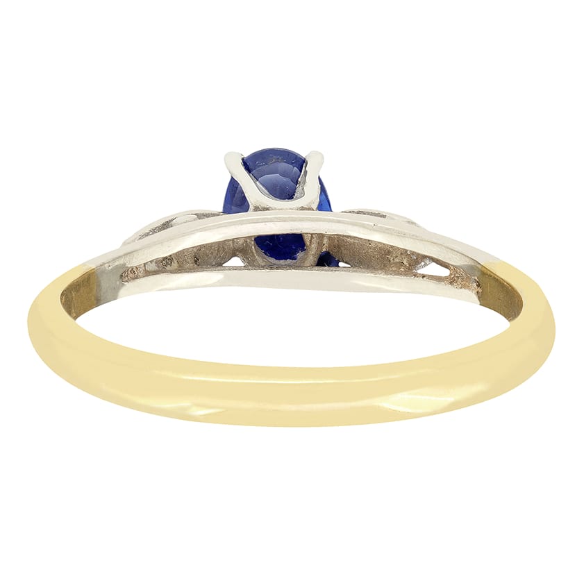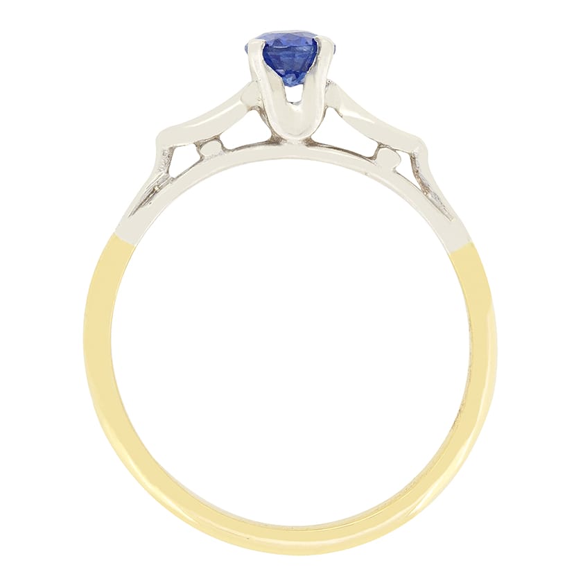 Dating to the 1950s, comes this beautiful sapphire solitaire ring. The oval cut stone is a vivid blue colour and weighs 0.50 carat. The sapphire is set within an 18 carat white gold collet, contrasting perfectly. Shaped shoulders of the same metal flank the centre stone, leading down into a band of 18 carat yellow gold.