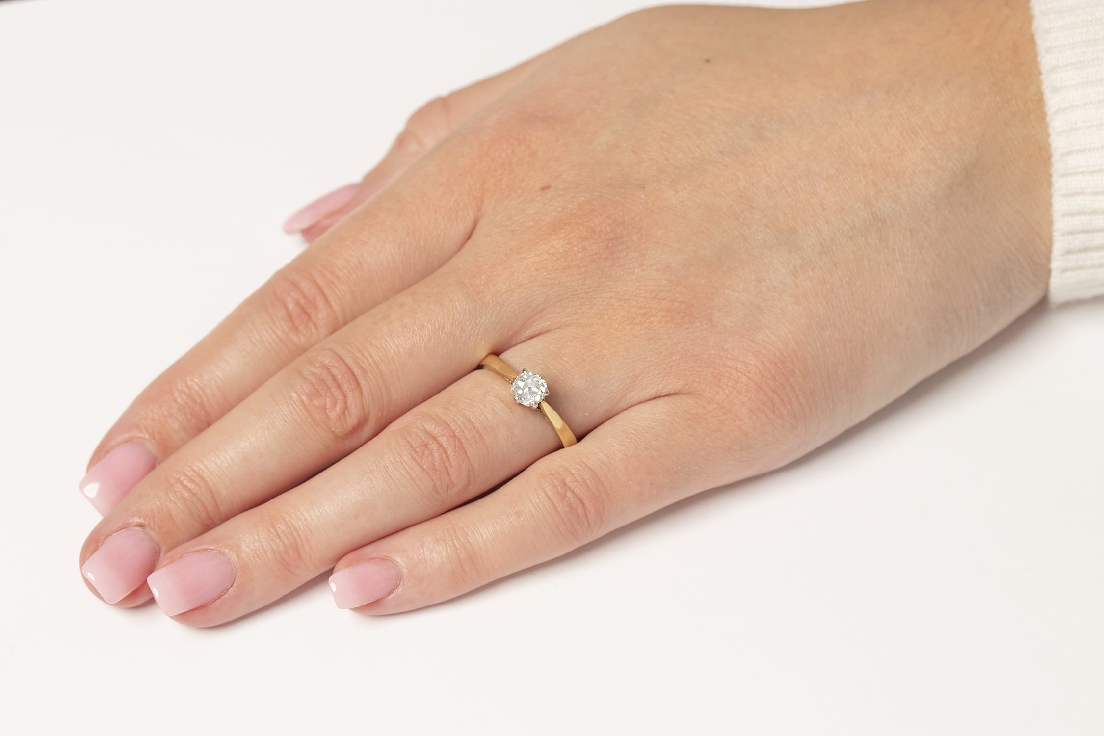 A classic example of a solitaire ring, this piece dates back to the 1950s. The old cut 0.55 carat diamond is claw set within an 18 carat white gold mount, then finished with an 18 carat yellow gold band. The stone is I in colour and SI1 in clarity.