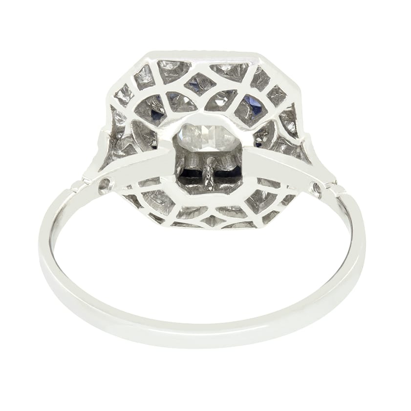 This beautiful vintage octagonal target ring dates back to the 1960s. It features an emerald diamond at its centre, weighing 0.70 carat. Graded highly at F in colour and VS2 in clarity, the diamond is rub over set to create a clean look. Surrounding this central diamond is a striking frame of square baguette cut sapphires, totalling 0.40 carats. A second halo of round brilliant cut diamonds, totalling 0.52 carat completes the design. Intricate millgrain detailing separates each layer of stones, with delicate, open basket work below allowing plenty of light in beneath the stone. Down each shoulder a further three small diamonds are sat leading down into the band. This stunning piece is crafted entirely in platinum.