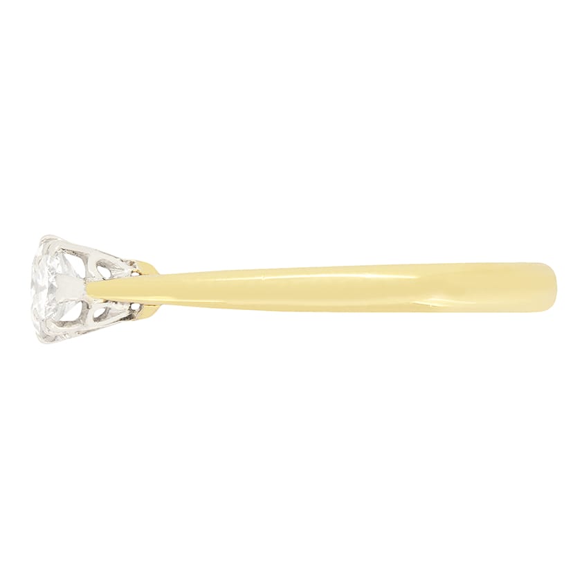 This charming trilogy ring dates back to the 1940s. A 0.30 carat transitional cut diamond features in the centre, flanked on either side by a 0.20 carat diamond of the same cut. The three stones have all been estimated G in colour and rang from VS1-VS2 in clarity. The diamonds are claw set into platinum, which really helps to highlight the quality of the diamonds. The ring is then finished with a band of 18 carat yellow gold.