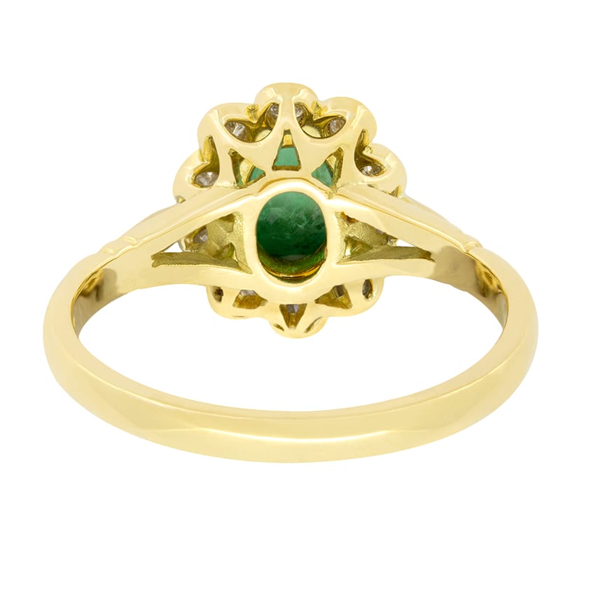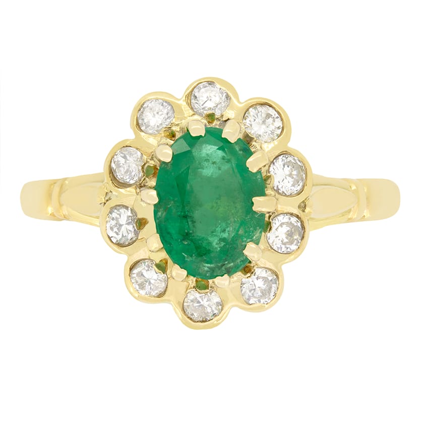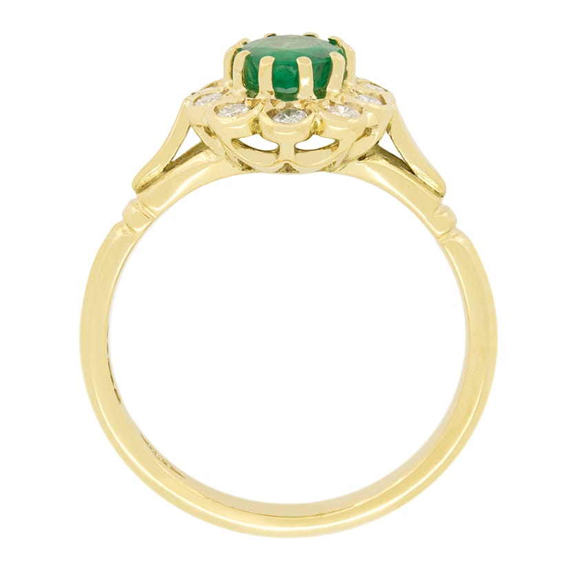 A vibrant green emerald features in this wonderful vintage ring. The 0.85 carat emerald is an oval cut stone, firmly claw set within 18 carat yellow gold. A cluster of ten round brilliant diamonds surround. The diamonds total 0.30 carat and have been given a colour grading of G and range in clarity between VS and SI. Elegantly crafted split shoulders lead down into a band of 18 carat gold, completing this lovely vintage piece.