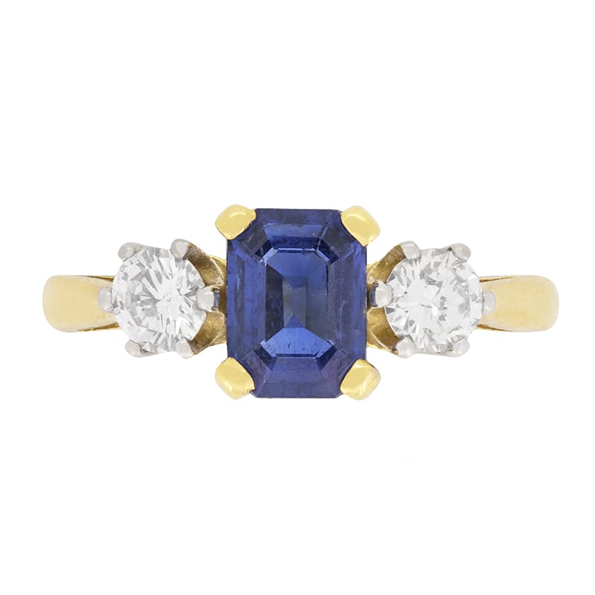 An eye pleasing 0.90 carat sapphire sits in between two 0.25 carat round brilliant cut diamonds. The diamonds have been estimated as G in colour and SI1 in clarity, complimenting the blue sapphire. The sapphire has been set into an 18ct yellow gold four claw collet which leads through to the shoulders. To further show off the diamonds, they have been set into white gold six claw collets. This ring dates back to circa 1970s.