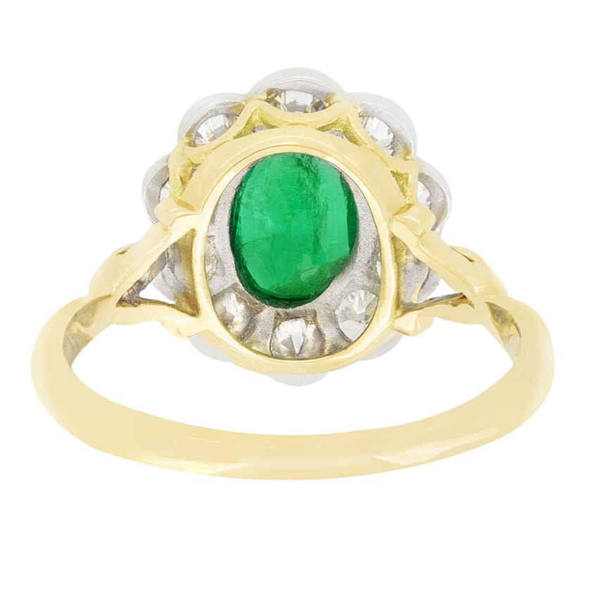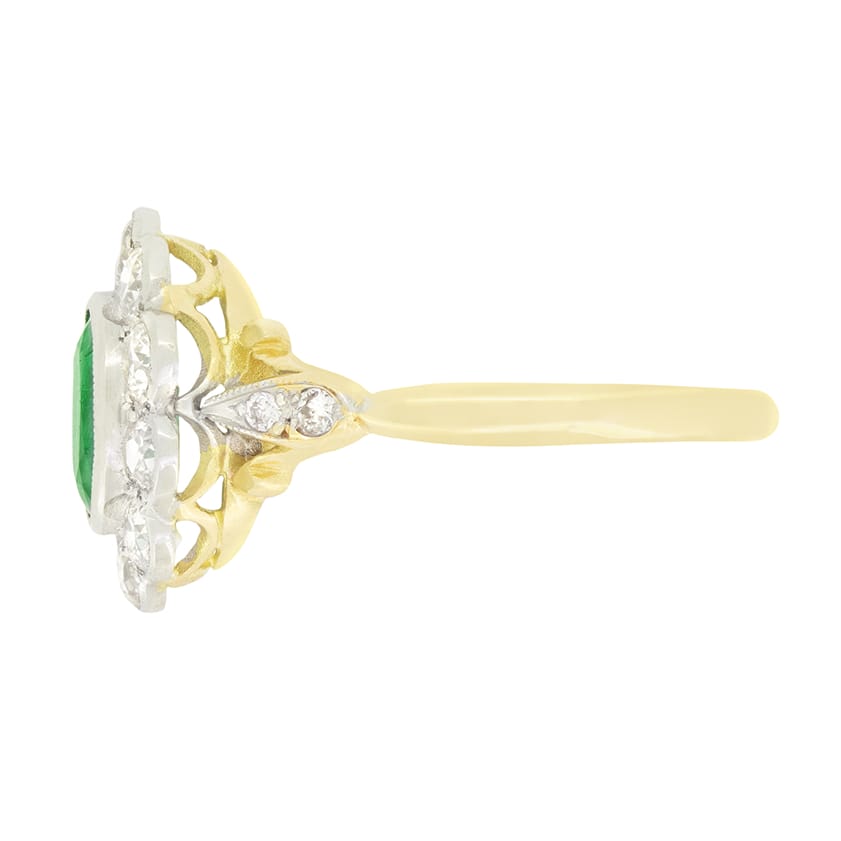 Dating to the 1970s, this wonderful cluster ring centres around a vivid emerald. The oval cut stone sits at 1.00 carat and is surrounded by a cluster of old cut diamonds. The diamonds total 1.00 carat and match in quality, with colour of G and clarity of VS An additional three diamonds on each shoulder add extra sparkle with a total of 0.14 carat Each gem has been expertly set into platinum whilst the basket and band are crafted in contrasting 18 carat yellow gold.