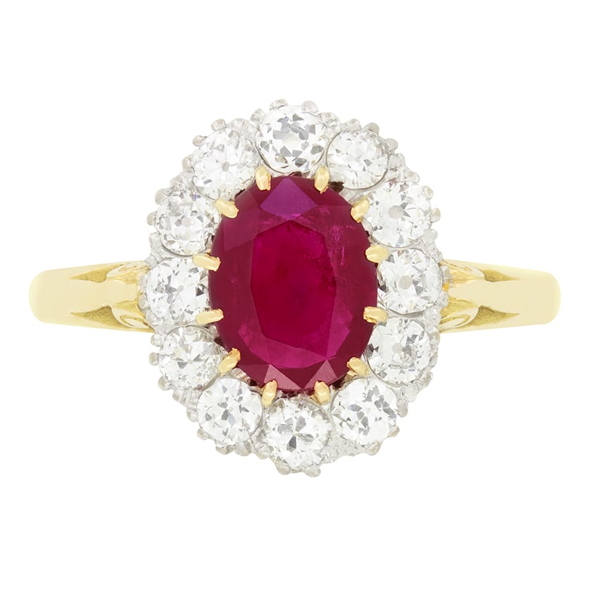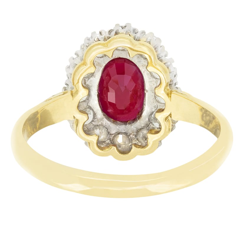 This beautiful vintage cluster ring centres around a vibrant 1.00 carat ruby. The oval stone is claw set within 18 carat yellow gold and surrounded by a cluster of old cut diamonds totalling 0.60 carat. The diamonds are of high quality with matching colour of F and clarity of VS. The diamond halo is set in platinum, wonderfully contrasting the handcarved 18 carat yellow gold basket and band.