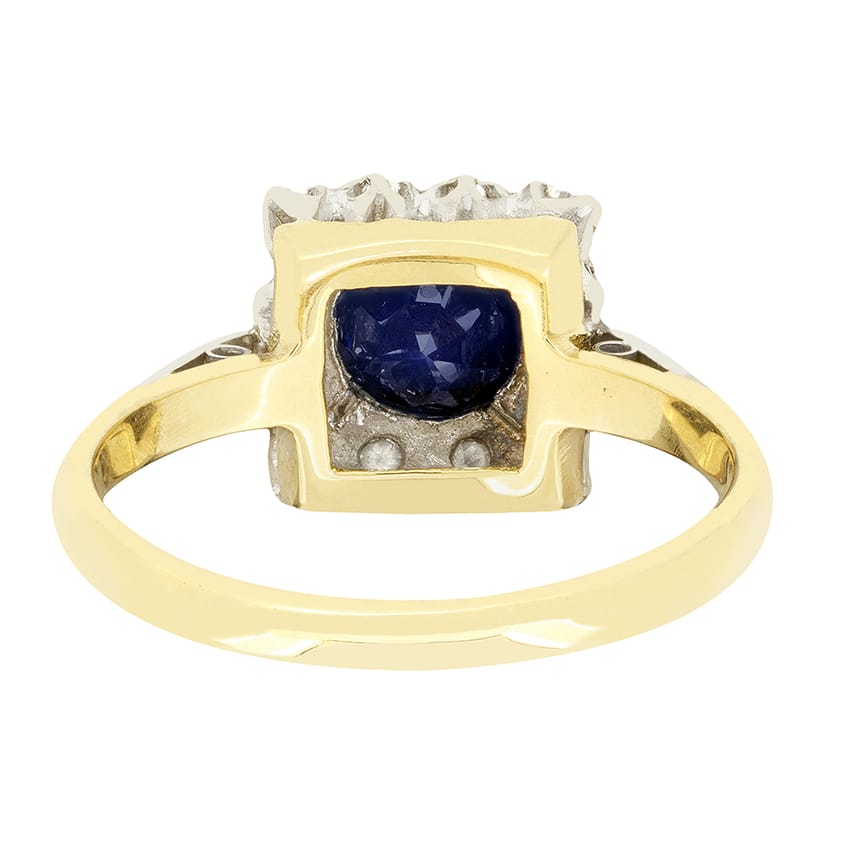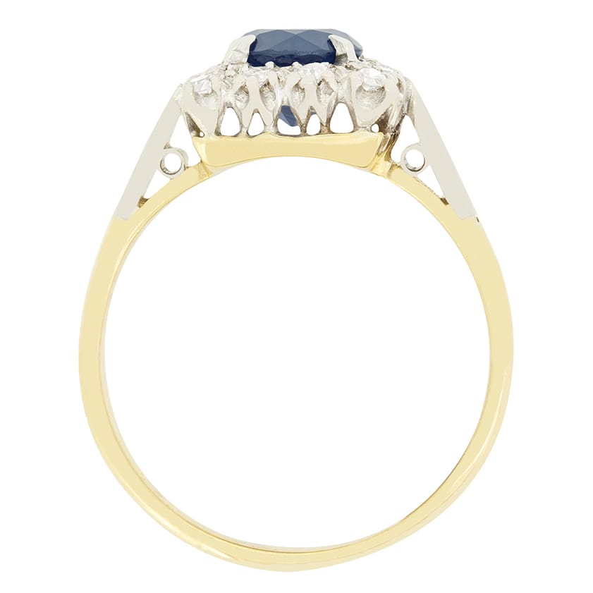 A deep blue sapphire sits central to this wonderful cluster ring, dating to the 1950s. The round cut stone weighs 1.00 carat and is expertly claw set into platinum. Surrounding the sapphire a square halo of eight cut diamonds sparkle. Totalling 0.12 carat, the diamonds match in colour at H and in clarity at VS. The platinum head and shoulders sit upon a band of contrasting 18 carat yellow gold, the mix of metals complementing blue of the sapphire beautifully.