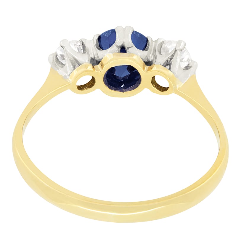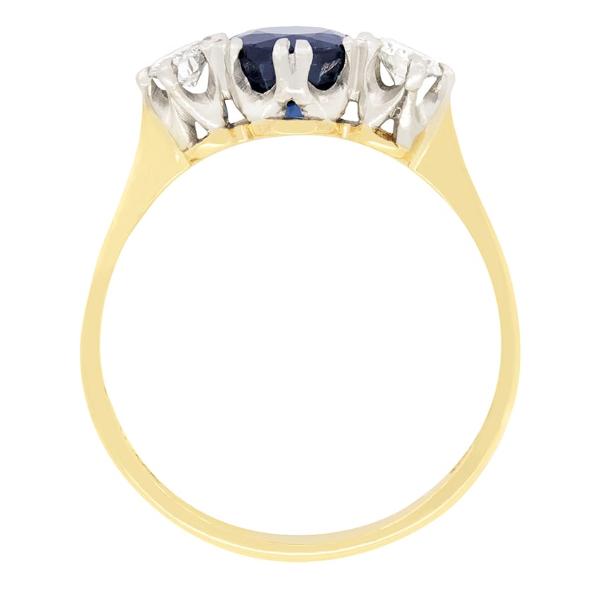 This wonderful vintage trilogy ring features a vivid blue sapphire at it’s centre, flanked by a pair of transitional cut diamonds. The sapphire is a 1.10 carat, round cut stone. The two diamonds are 0.25 carat a piece and have been graded H in colour and SI in clarity. All three stones have been claw set into a platinum mount whilst the band has been crafted from 18 carat yellow gold.