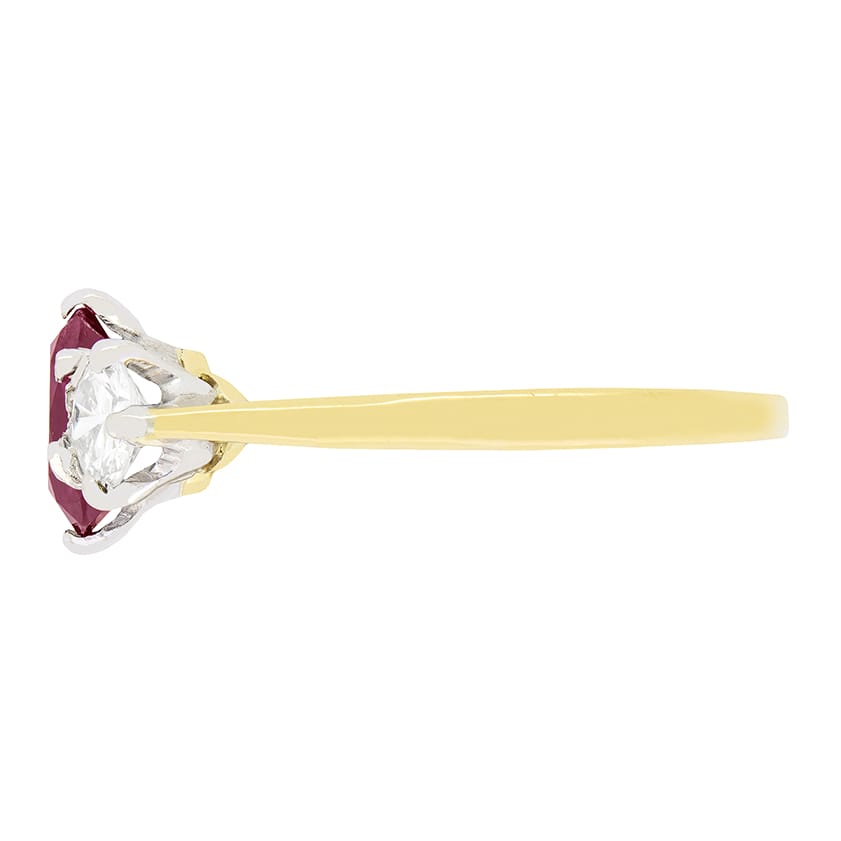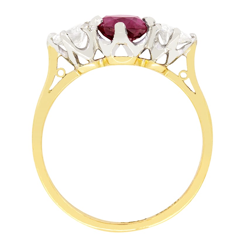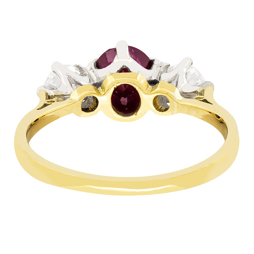 A beautiful wine red ruby sits central to this vintage three stone ring. The oval cut ruby has a carat weight of 1.20 carat. Contrasting either side are a pair of sparkling round brilliant diamonds of 0.25 carat each. Matching in quality, they have been graded as G in colour and VS2 in clarity. Elegant claws hold all three stones into a platinum collet. A band of 18 carat yellow gold completes the piece perfectly