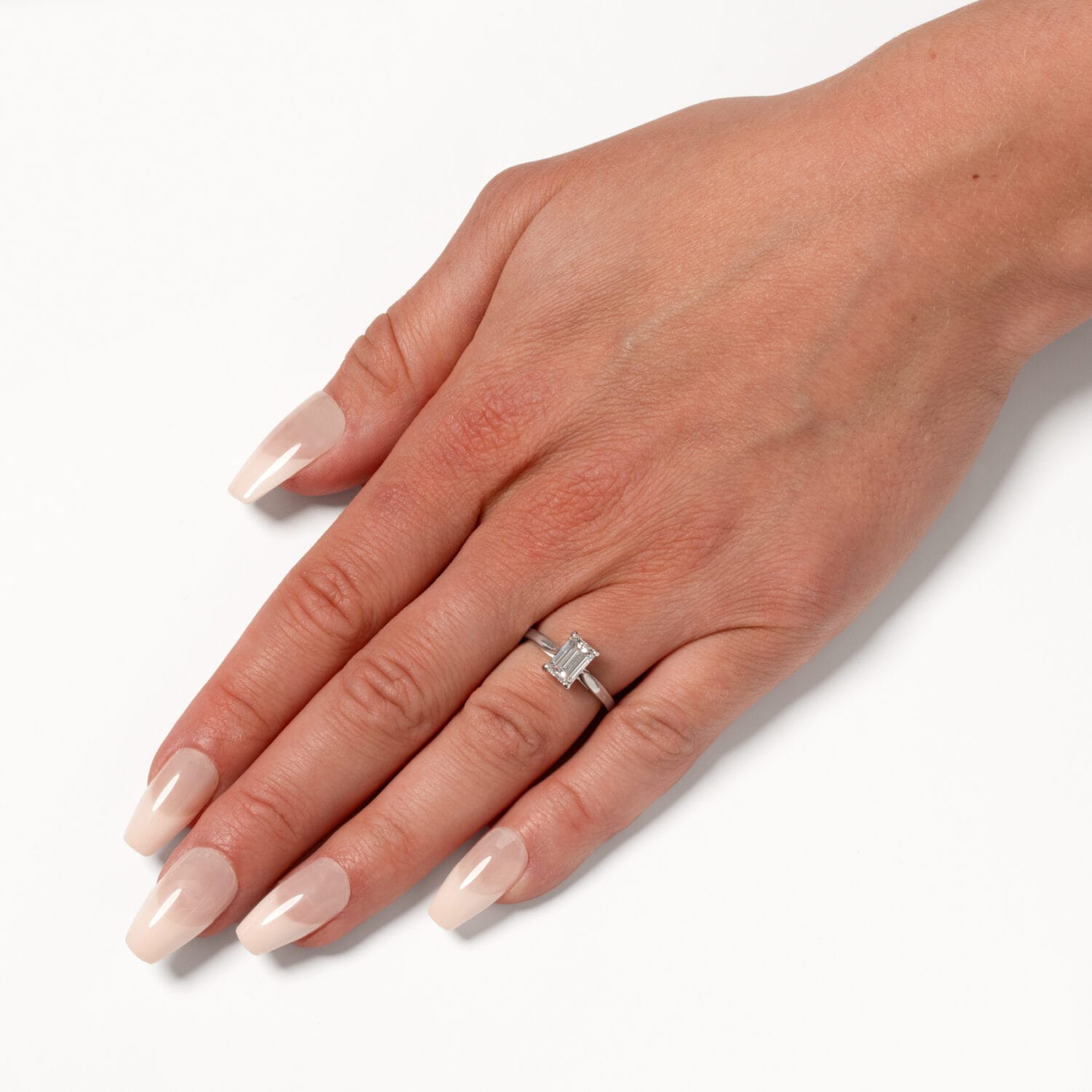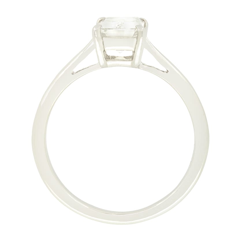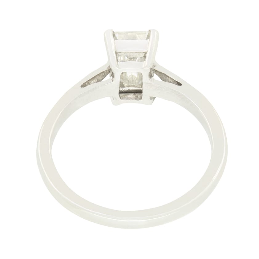 Simple yet elegant, this Vintage solitaire ring features a central emerald cut diamond. Weighing 1.22 carat, the diamond is of excellent quality with a colour of F and clarity of VS2 as certified by GIA. The stone is set into a platinum collet and sits upon a band of the same metal.