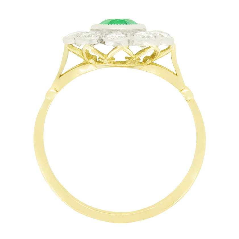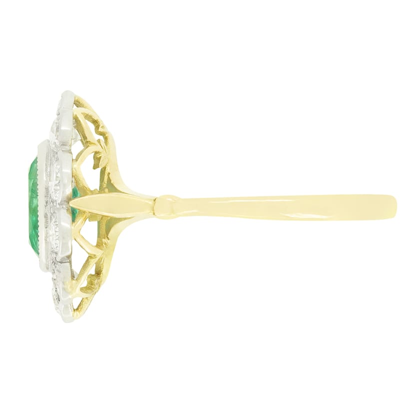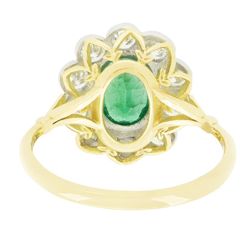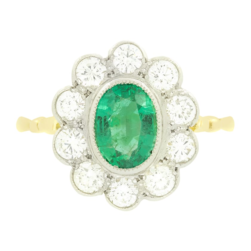 A beautiful green emerald takes centre stage in this vintage cluster ring. The Oval cut emerald weighs 1.30 carat and is rub over set into platinum. Surrounding the central stone, a total of 1.50 carat round brilliant diamonds are set, contrasting the emerald and highlighting both perfectly. The diamonds match in colour at G and VS in clarity. The platinum head sits upon a contrasting band of 18 carat yellow gold.