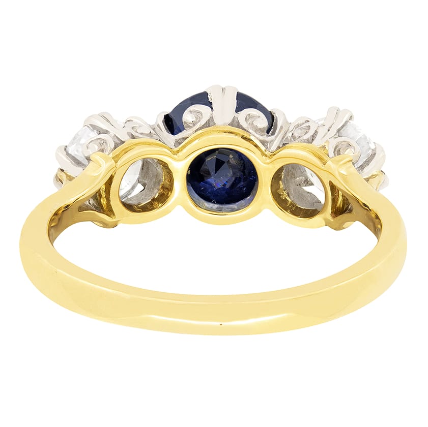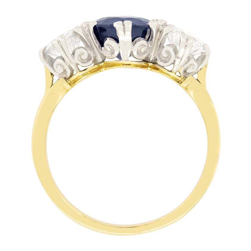 This stunning sapphire and diamond trilogy ring features a natural deep blue sapphire at its centre, complemented by a pair of round brilliant cut diamonds. The central Sapphire is a round cut stone with a carat weight of 1.60. The flanking diamonds weigh 0.50 carat a piece and are graded F in colour with clarity ranging from VS to SI. The stones are expertly claw set into decorative platinum collets, whilst the band is made of 18 carat yellow gold.