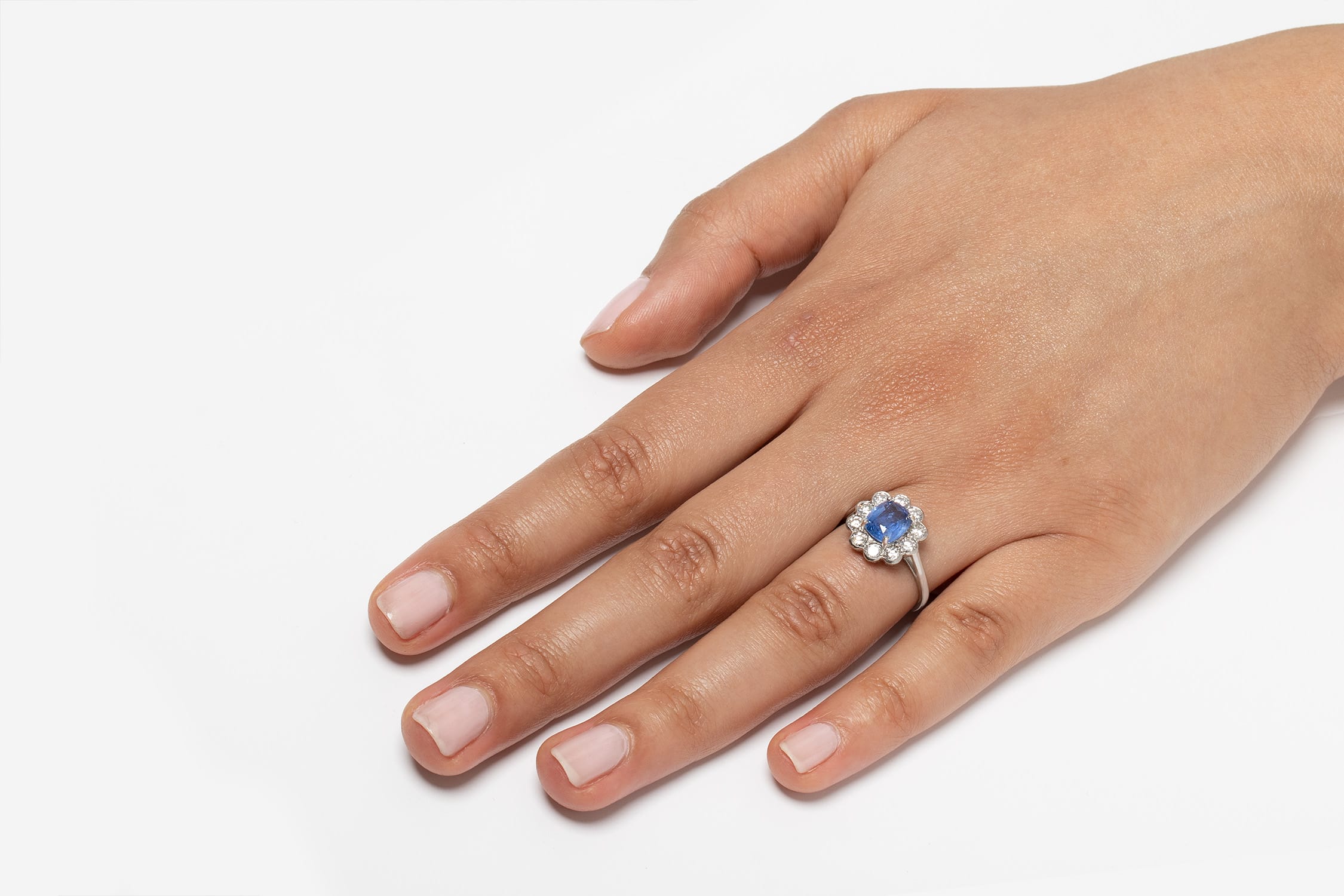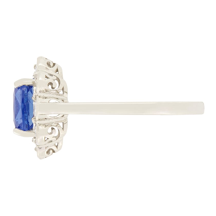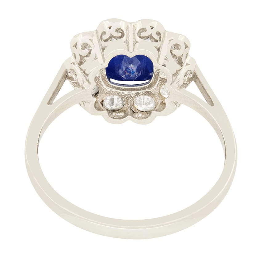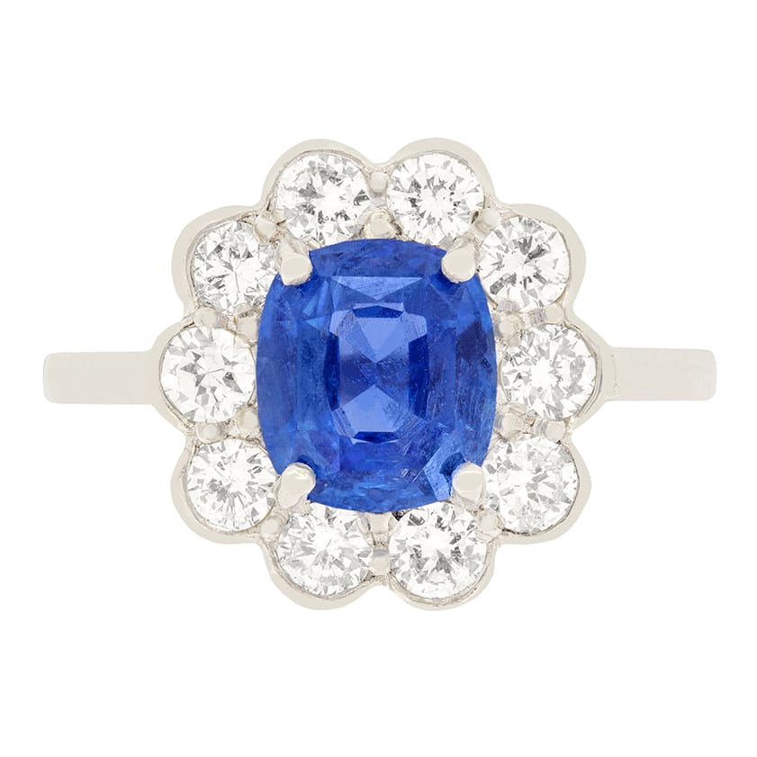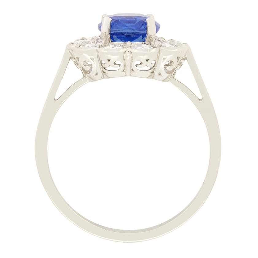 An outstanding natural vivid blue sapphire is the focal point of this vintage, platinum ring. The sapphire is of a cushion shape and weighs 1.83 carat. Set within platinum claws, it is also surrounded by a sparkling cluster halo of round brilliant diamonds. These diamonds total to 0.75 carat and have been estimated as G in colour and VS-SI in clarity. The diamonds are encased within a metal edging and discrete claws, gently securing them in. Excellent craftsmanship can be witnessed in the gallery, adding a touch of elegance to this engagement ring.
