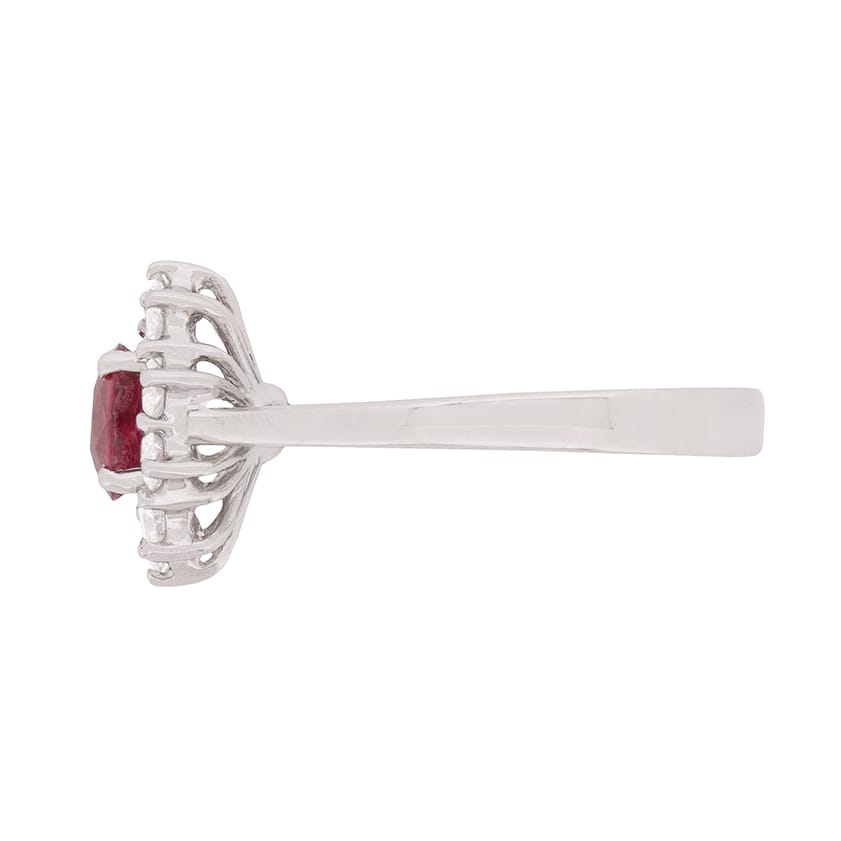 Dating to the 1980s, this classically designed cluster ring features a wonderful red ruby in the centre. The gemstone is full of life and has a weight of 1.84 carat. It is set within a four claw collet and is encircled by dazzling round brilliant diamonds, which are also claw set. They total 0.50 carat and have been graded the quality grades of F in colour and VS in clarity. The whole piece is made from 18 carat white gold, allowing the diamonds to sparkle and work in perfect harmony with the centre ruby.