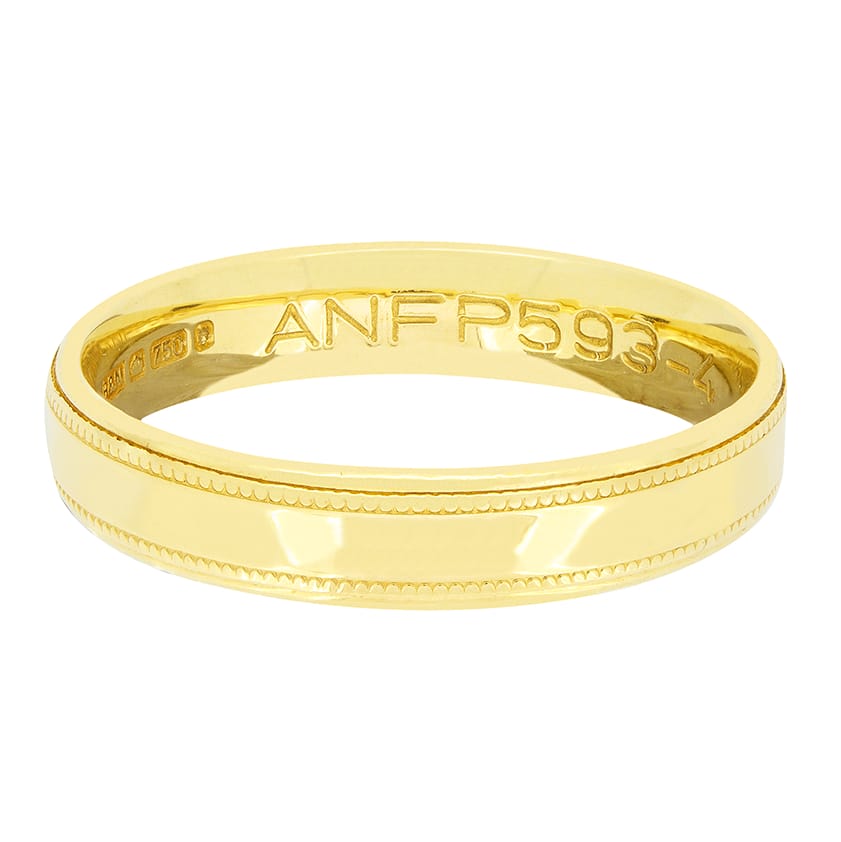Dating to the 1980s this charming wedding band is crafted in 18 carat yellow gold. The 4mm wide band features a milgrain edge design along top and bottom of the band. The band is a size P 1/2 and weighs a total of 4 grams.