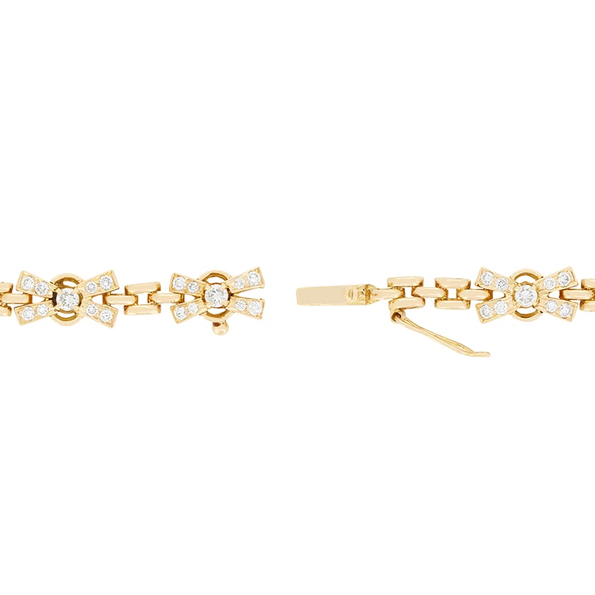 A total of 2.00 carat in sparkling round brilliant diamonds adorn this beautiful bracelet from the 1980s. Crafted in 18 carat yellow gold, each bracelet link is formed in a sweet bow design. Each of the nine bows is set with a single 0.10 carat diamond at its centre, with 1.10 carat total of smaller diamonds set surrounding. Each diamond matches perfectly in quality at G in colour and VS in clarity. The bracelet sits at 17.5cm on the wrist, making it incredibly wearable for both day-to-day and special occasions.