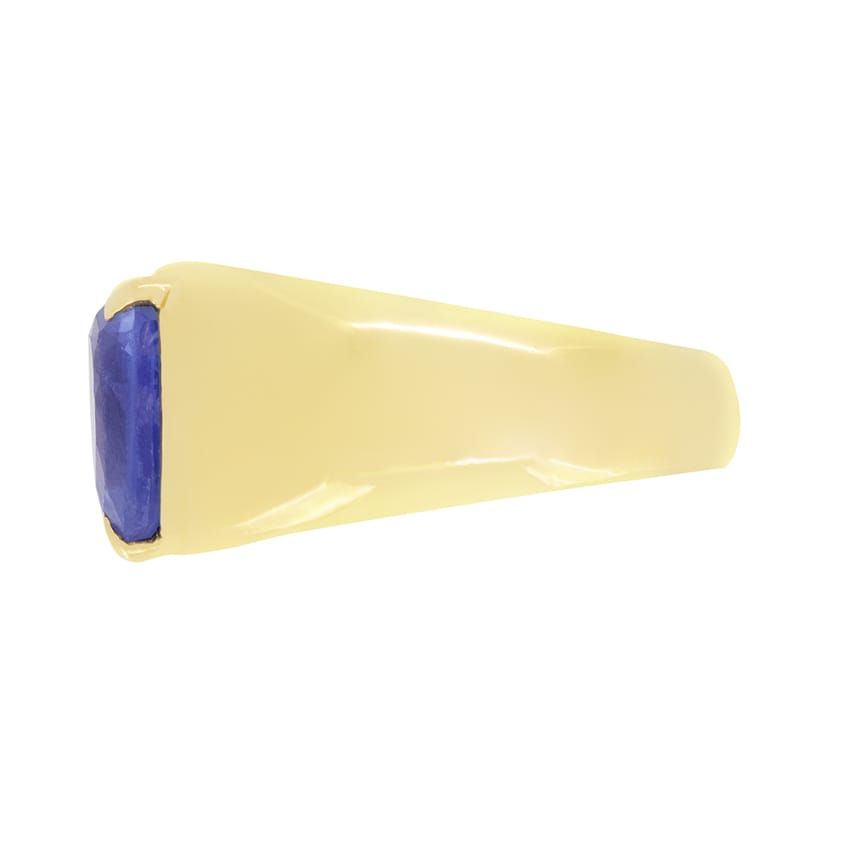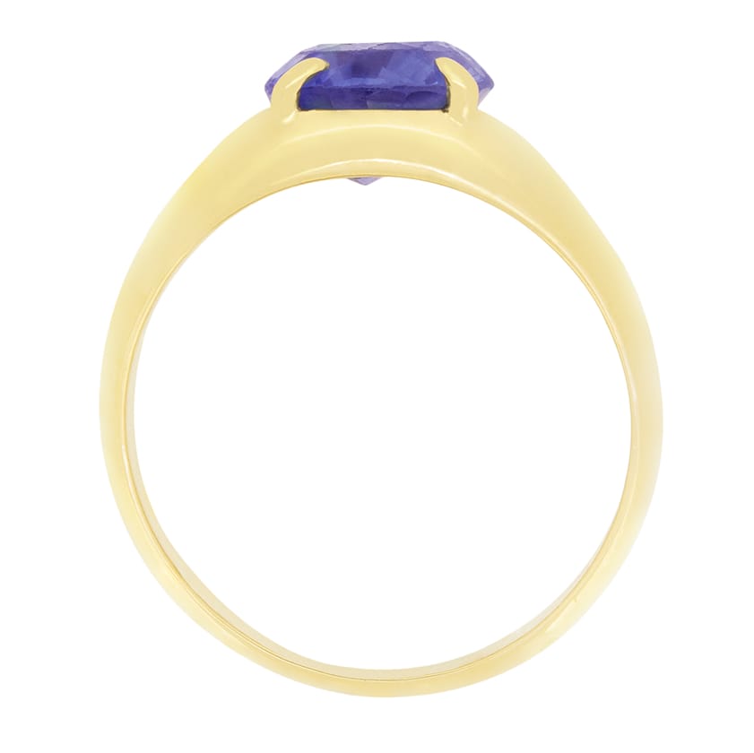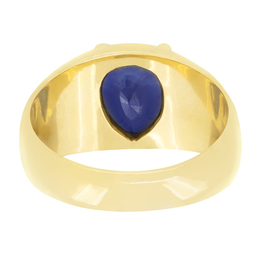 Dating to the 1970s, this chunky gold ring features a single pear cut sapphire. The impressive 2.65 carat pear is a vibrant mid-blue colour and is claw set into 18 carat yellow gold. At its widest, the gold band sits at 10mm, tapering around the finger to 3.85mm, making it an incredibly wearable showpiece.