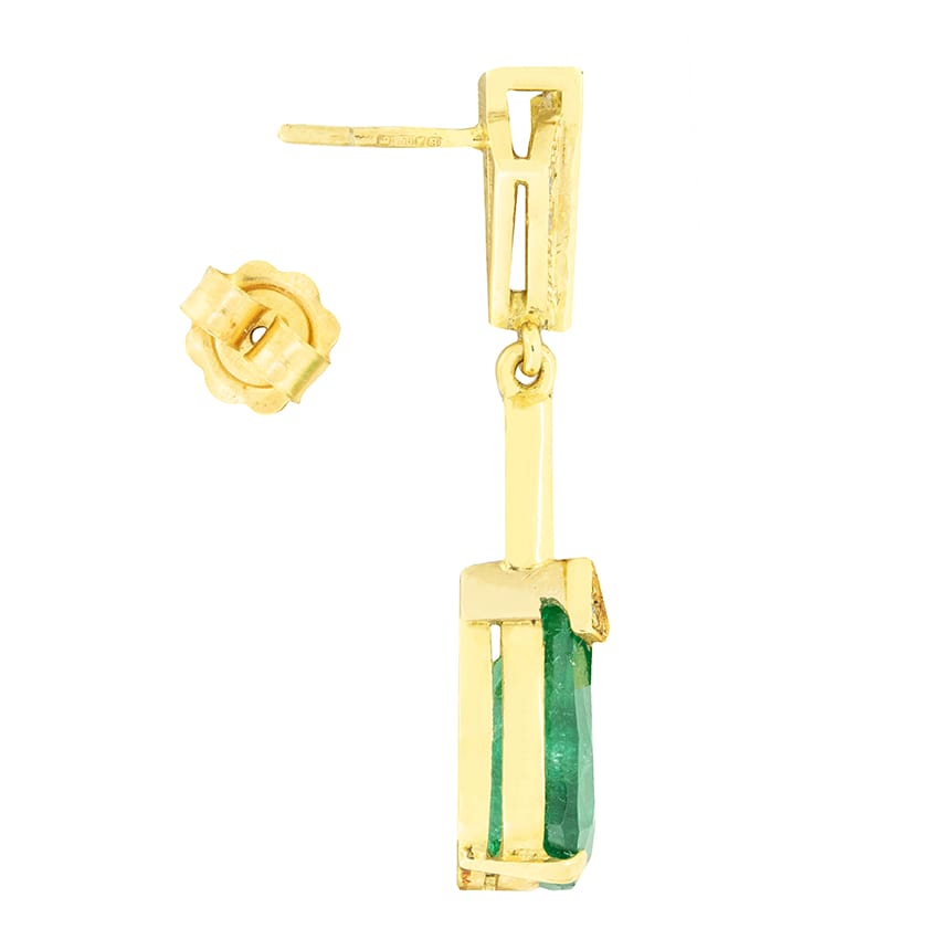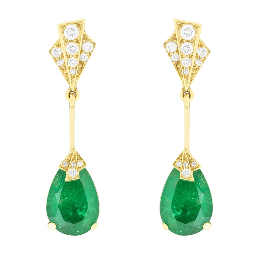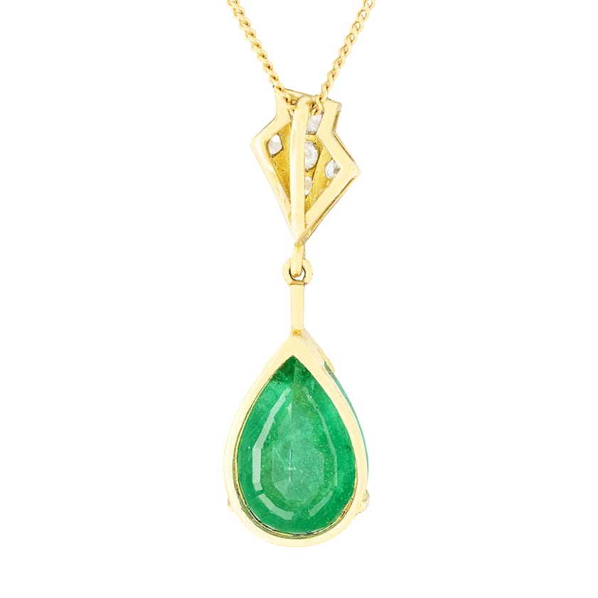 Beautifully vintage in style, this matching necklace and earring set centres on a collection of vibrant, pear cut emeralds. The necklace emerald sits largest at an impressive 9.00 carat. Claw set in 18 carat yellow gold, the emerald forms an elegant drop below fan-shaped metalwork set with round brilliant diamonds. The diamonds match in quality at F in colour and VS1 in clarity. The earrings are of the same style with a pair of smaller 6.00 carat emeralds. Further diamonds are set above each emerald, bringing the total to 1.00 carat and matching the necklace in quality. This stunning set can be purchased together or separately.