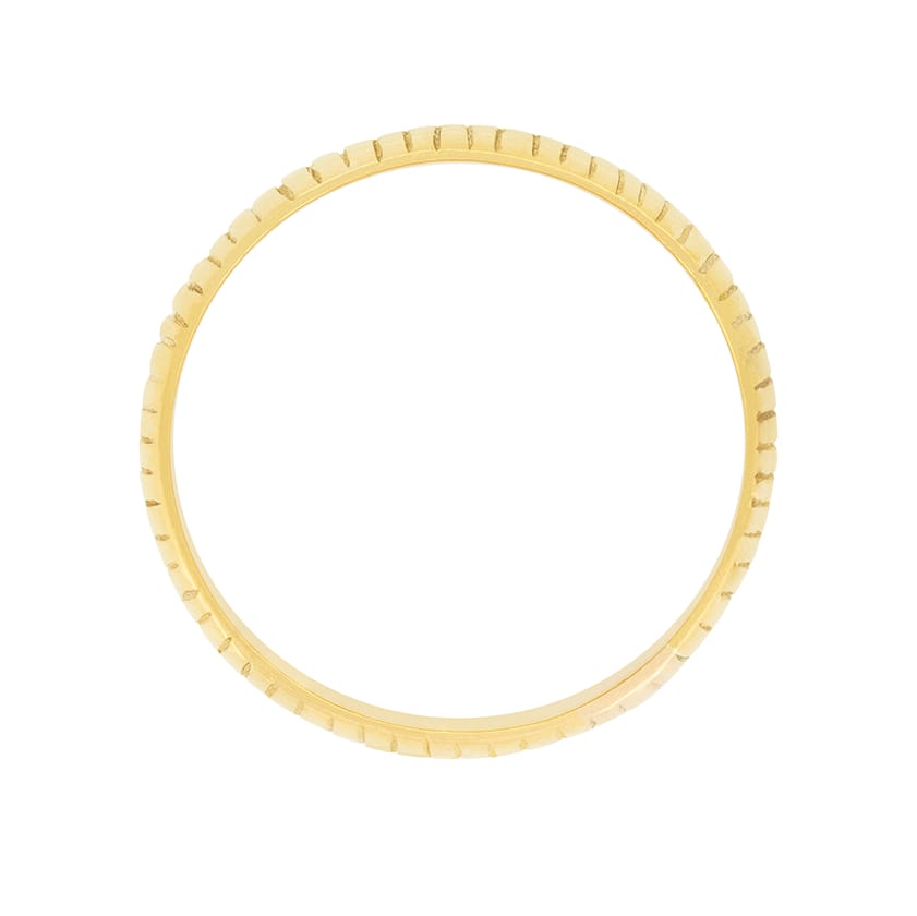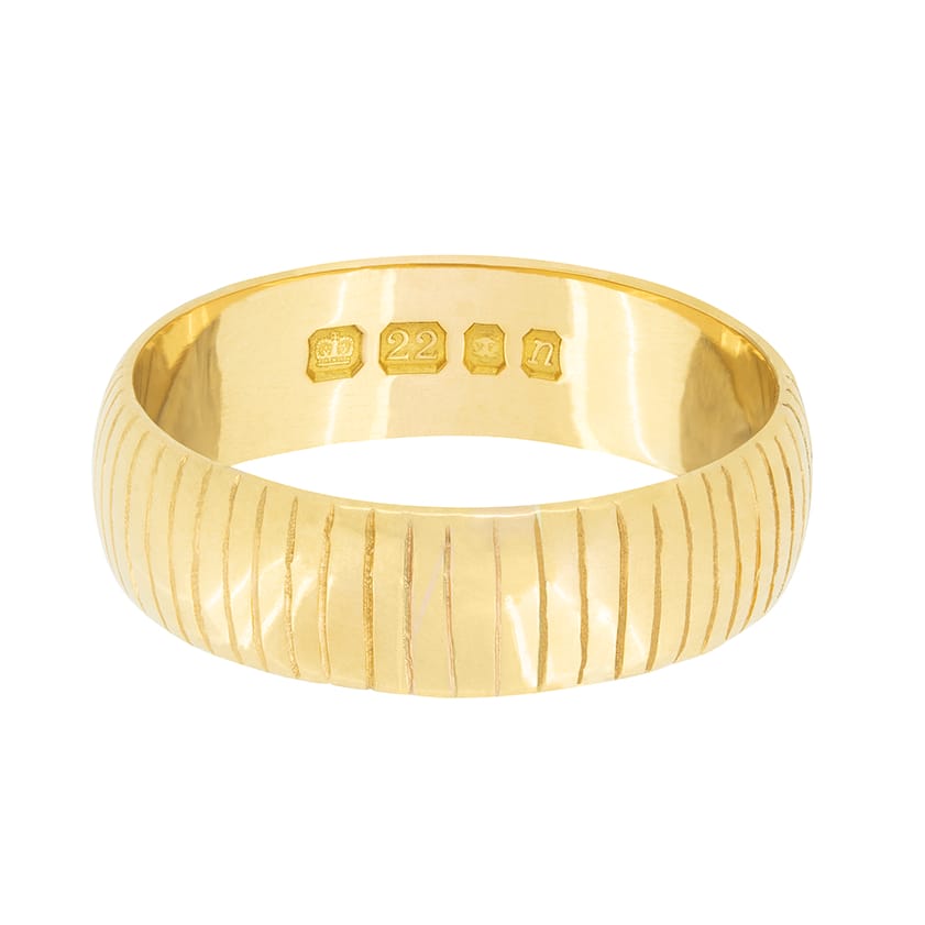 With hallmarks dating to 1968, this unique wedding band is crafted in 22 carat yellow gold. The 6mm band features a carved design with vertical lines running across its length. Weighing 6.6 grams this is a chunky band that sits well on the finger.