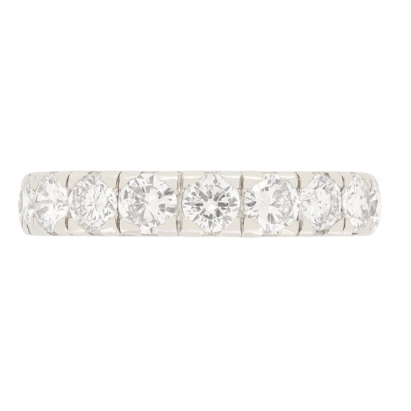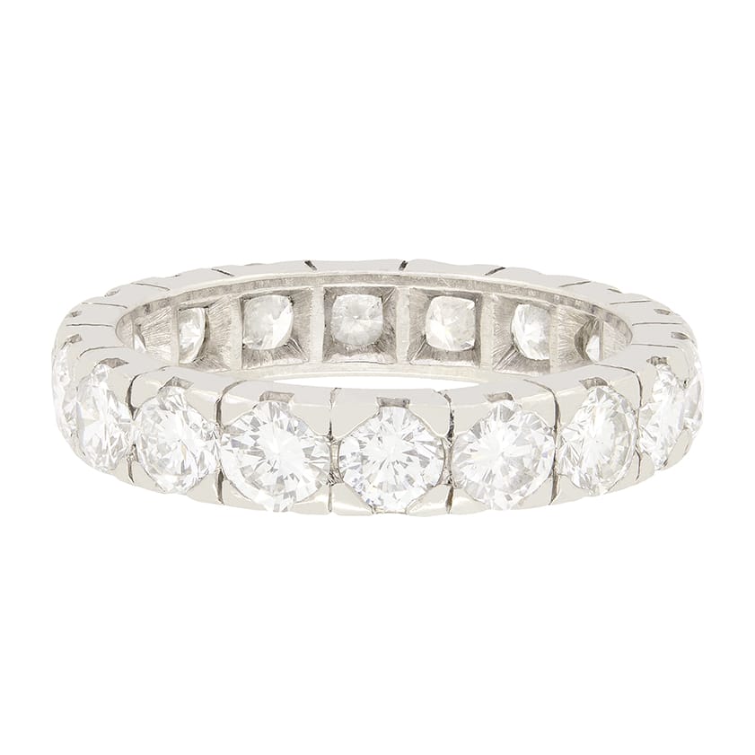 This stunning full eternity ring from the 1950s, originating in France, showcases a total of 3.24 carats of round brilliant diamonds, evenly spread across 18 diamonds adorning the band. The stones are matching in quality, with F in colour and VS in clarity. Crafted from 18 carat white gold, the ring features claw setting work to hold the diamonds in place, while delicate line detailing separating each stone.