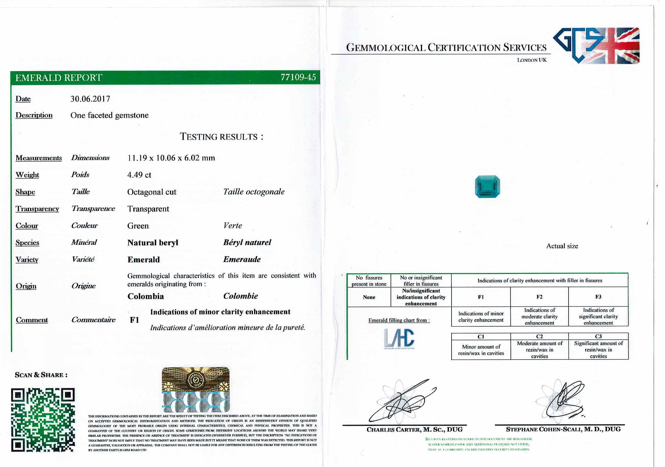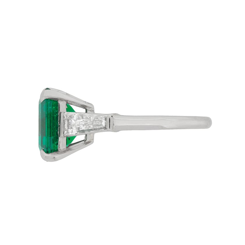 This truly stunning Emerald ring is one of a kind. The centre stone weighs 4.49 carat is a luscious deep green, supported by sparkling baguette cuts on the shoulders. The Emerald is a simply wonderful stone, originating from Colombian and graded as indications of minor clarity enhancement. The stone is certified by renowned lab GCS based in London. It is a fabulous cut as well, octagonal, allowing it to slot perfectly into the four claw setting. The two baguette cut diamonds each weigh 0.40 carat, and with an estimated colour grade of G and clarity VS. This ring has a wonderful elegance to it, and the setting work is made of platinum.