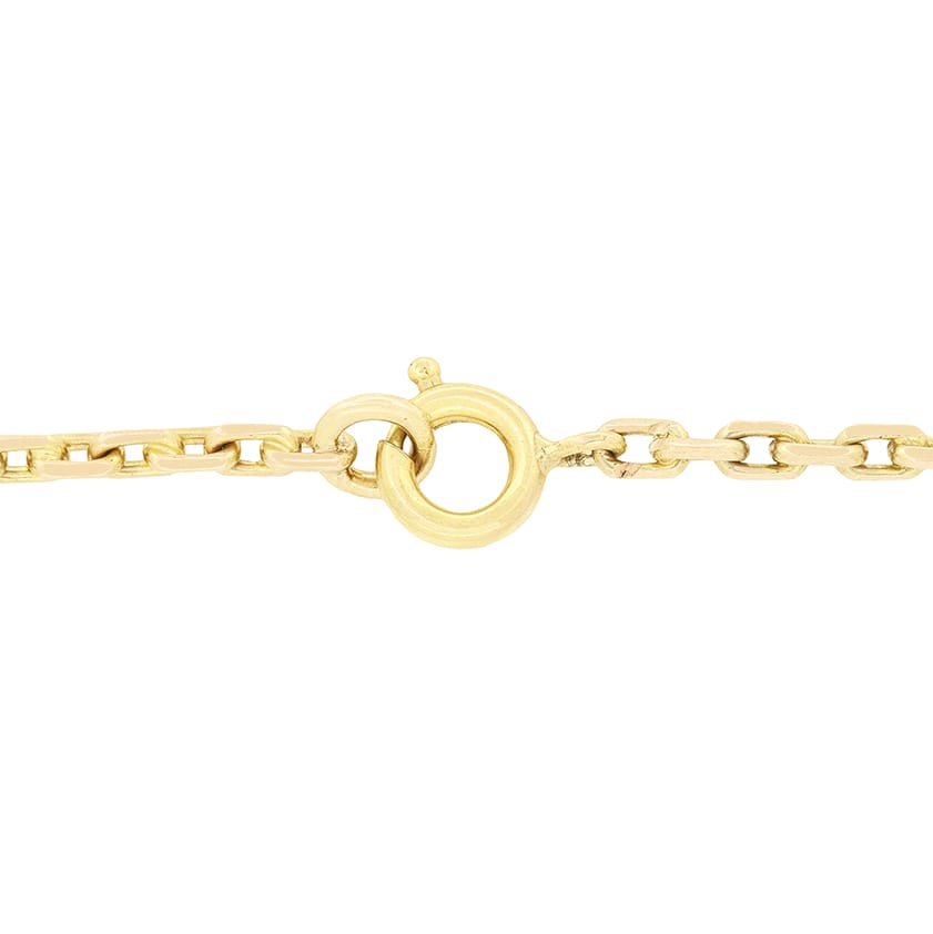 Dating back to the 1970s, this vintage chain is crafted from 9-carat rose gold. The chain is 28″ in length and weighs 15.7 grams. At 2.5mm wide, this chain is long yet wears beautifully at an incredibly wearable thickness.