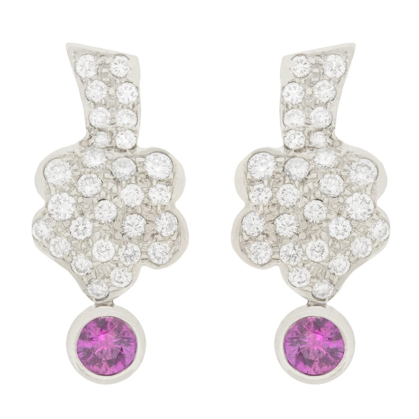 These abstract vintage earrings feature sparkling white diamonds and two pink sapphires. The diamonds are round brilliant cut, and total to 0.30 carat on each earring. They are graded as F colour and VS clarity. The sapphires are a dazzling pink colour and are 0.30 carat each. The earrings are crafted out of platinum, and are a perfect example of the quirky style of jewellery created in the 1950s.