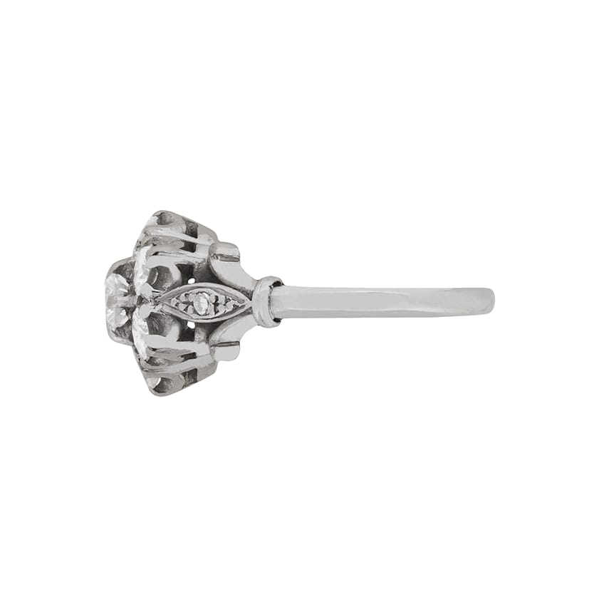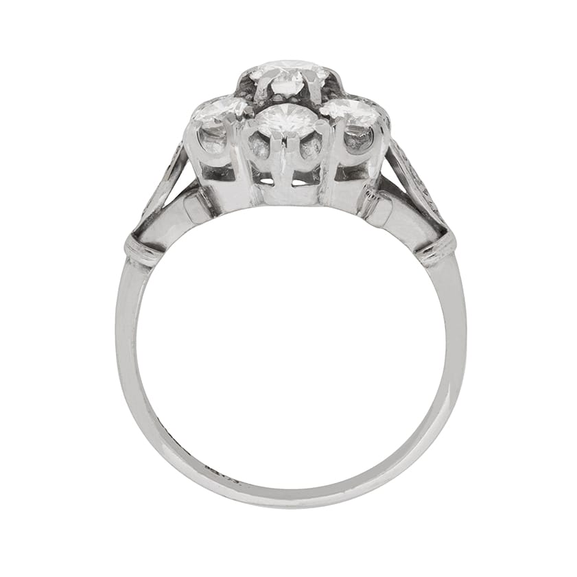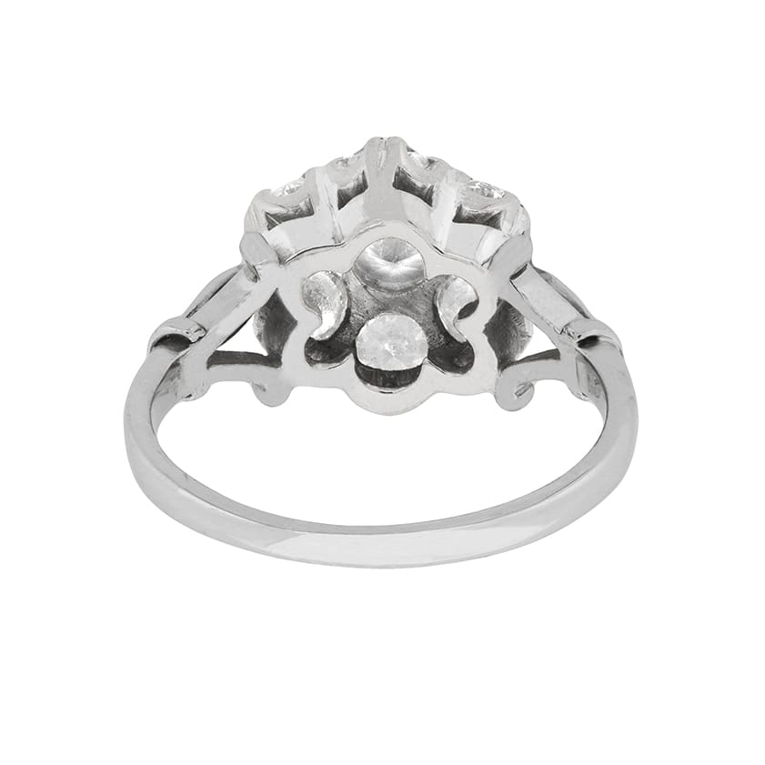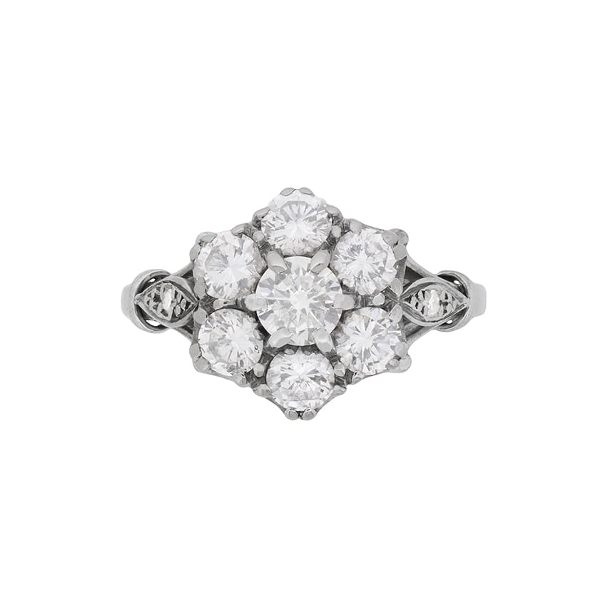 This show stopper cluster ring is in a typically vintage daisy look. It features a centre stone weighing 0.35 carat and is haloed beautifully by 6 round brilliant diamonds each weighing 0.30 carat. This brings the total to 2.15 carat, and the stones are of high quality. They are estimated to be F in colour and VS1 in clarity. All the stones are expertly claw set within the 18 carat white gold collet, which is held by trefoil shoulders. The centre band of the shoulders holds a 0.01 carat diamond, on either side, and they are grain set within a twist patterning. The band is also made of 28 carat white gold. Whilst it is not the traditional choice for an engagement ring, it is a stunning piece and would look amazing upon any finger!
