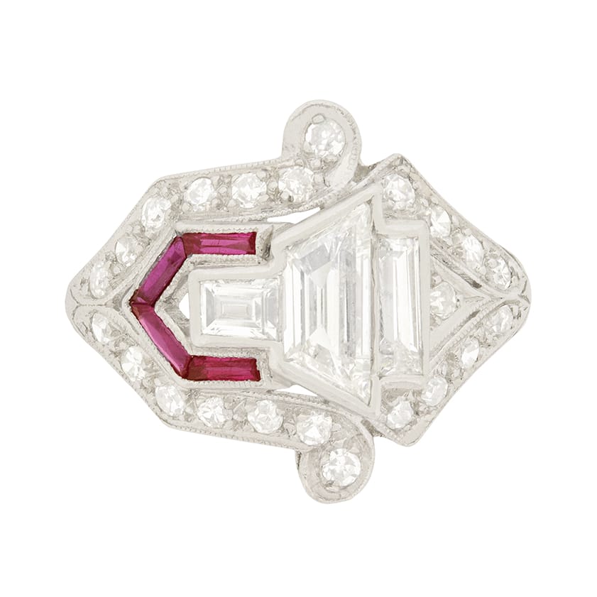 This is a bold cluster ring dates back to around the 1950s. The centre stone is a 0.50 carat trapeze cut diamond, surrounded by two baguette diamonds either side, creating an arrow shape. The outline of the ring is studded with eight-cut diamonds. The combined weight of all the diamonds is 1.14 carat and have a grade of G colour and VS2 clarity.