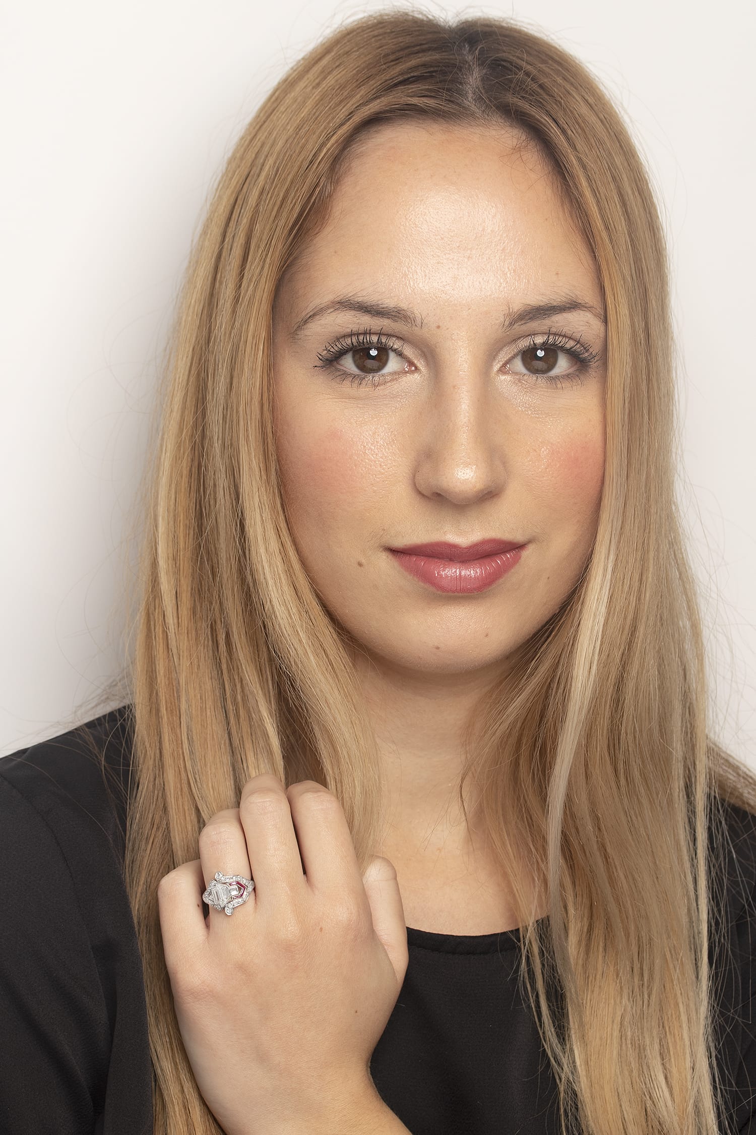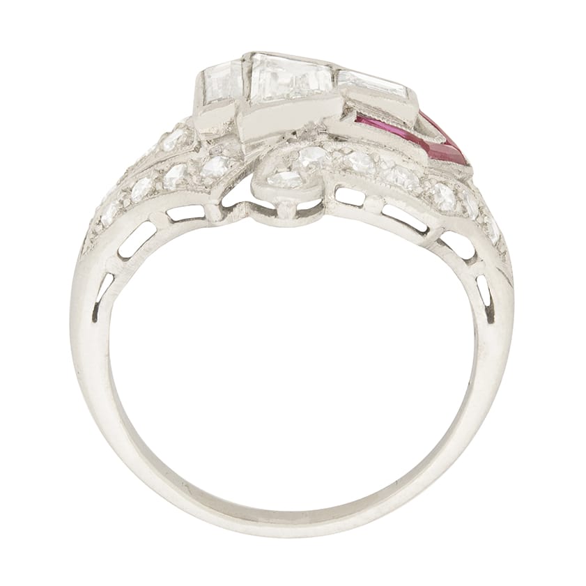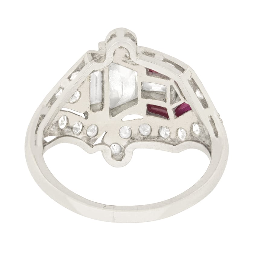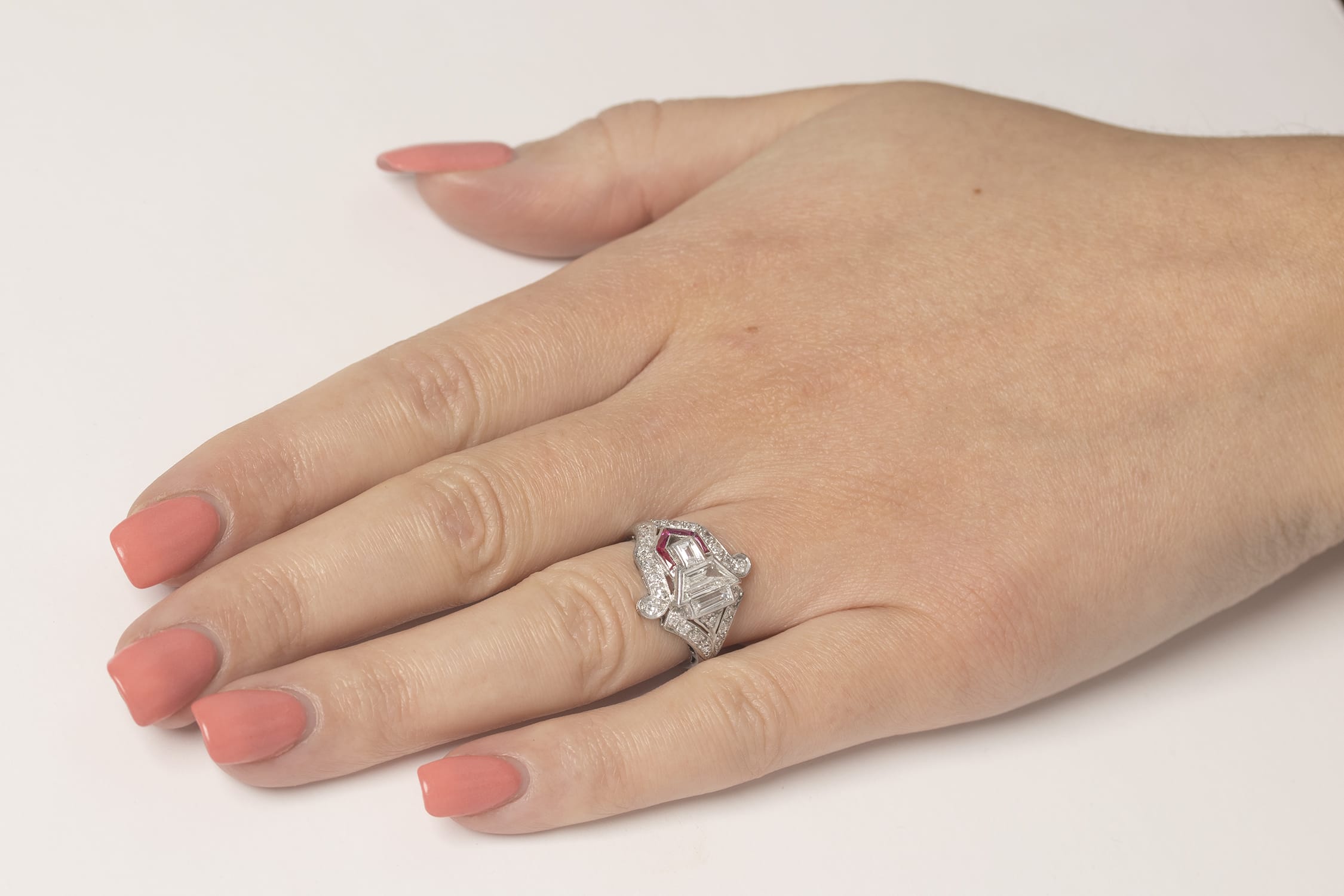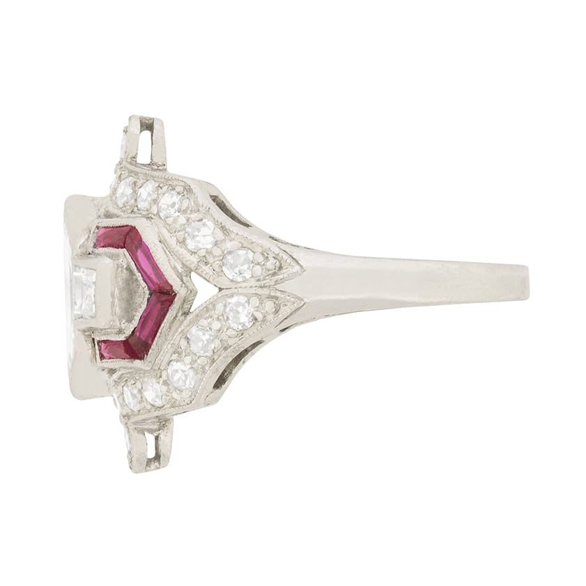 The ring is accented with french cuts rubies, adding a sense of vitality. They have a total weight of 0.10 carat and are a lovely pinkish red colour. The stones are grain set in the platinum mount.