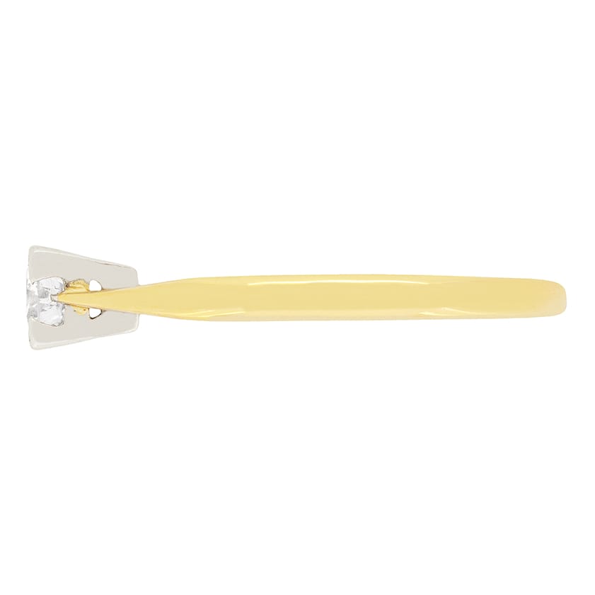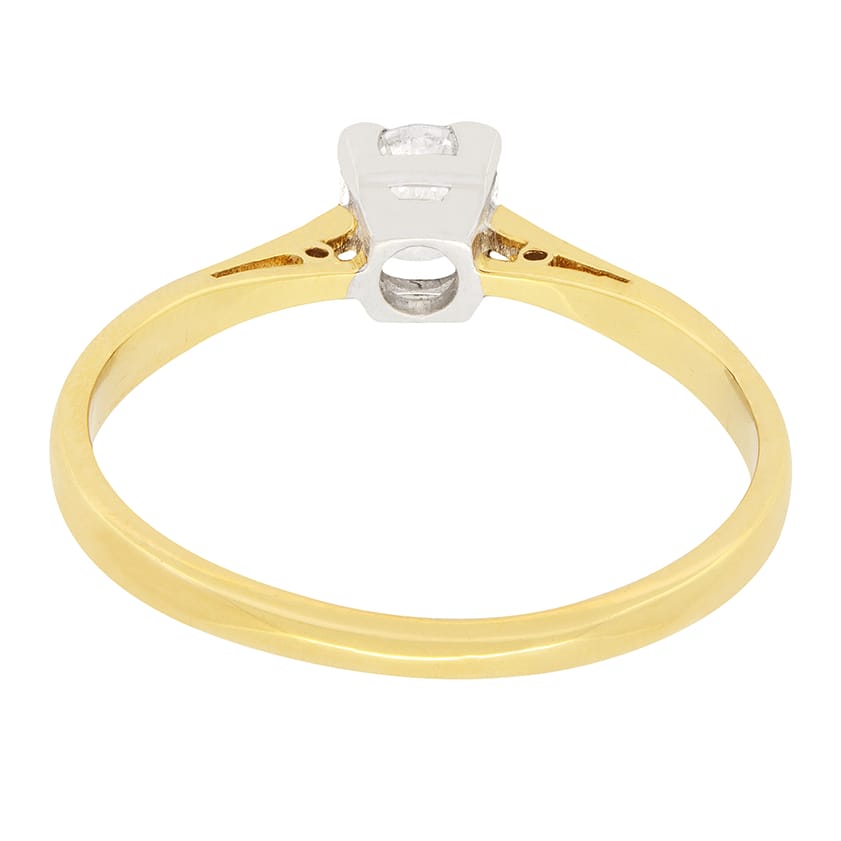 This delicate little solitaire ring features a single 0.35 carat round brilliant diamond in the centre of the square collet. The collet is made of platinum, typical of the era, whilst the band is made is 18 carat yellow gold. The diamond has a high estimated colour, of F and clarity VS1, so it does dazzle. The beautiful hand crafted hoops in the shoulder work is a sign of the craftsmanship involved with vintage jewellery.