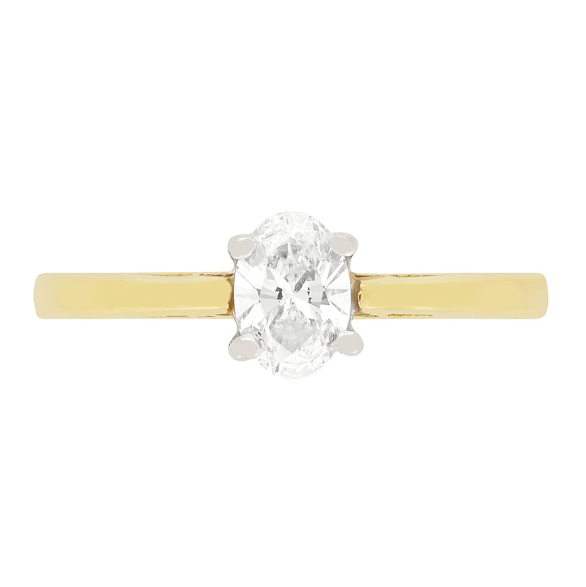 The claws, made of 18 carat white gold, delicately hold the beautiful stone on the 18 carat yellow gold band. This classic engagement ring style is given a lovely twist with the oval stone.