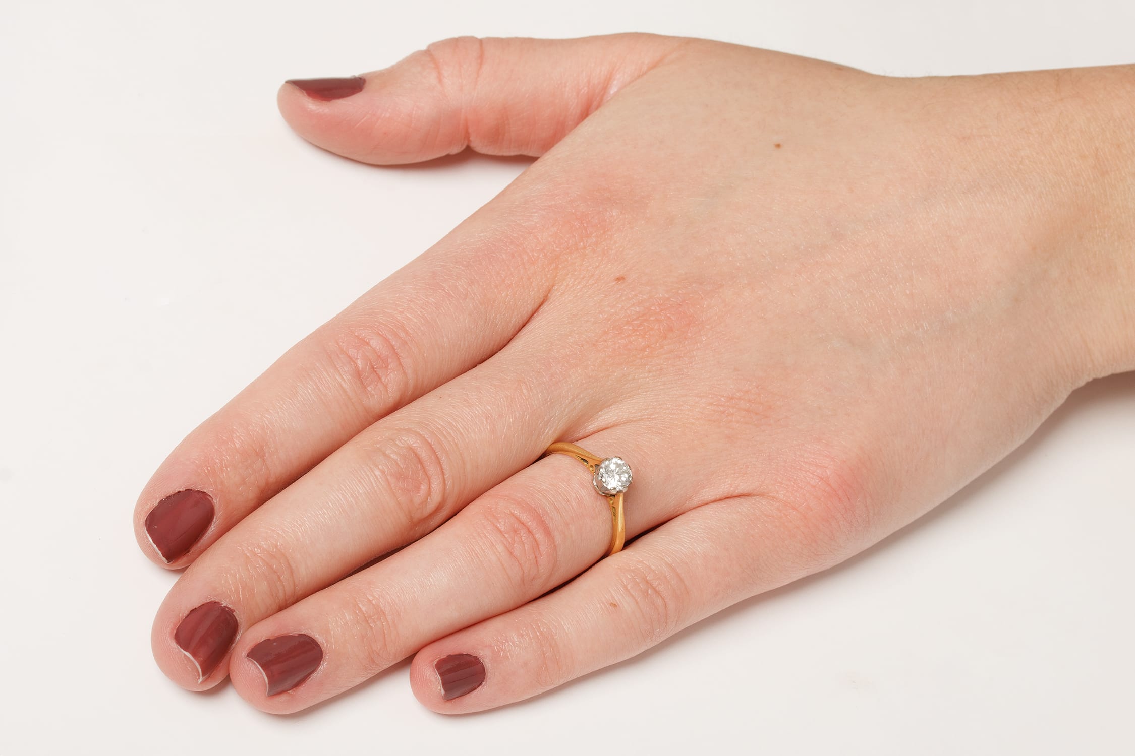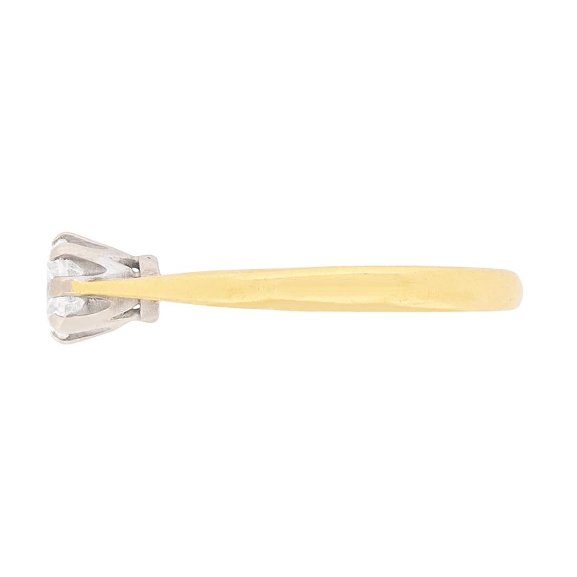 It is claw set, which shows off the sparkle and life of the diamond. The mount is made of platinum, again, shows the diamond to really shine, and the band is made of 18 carat yellow gold.