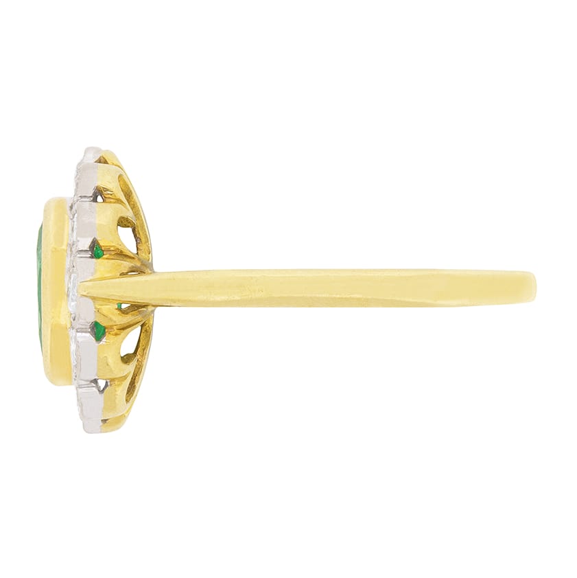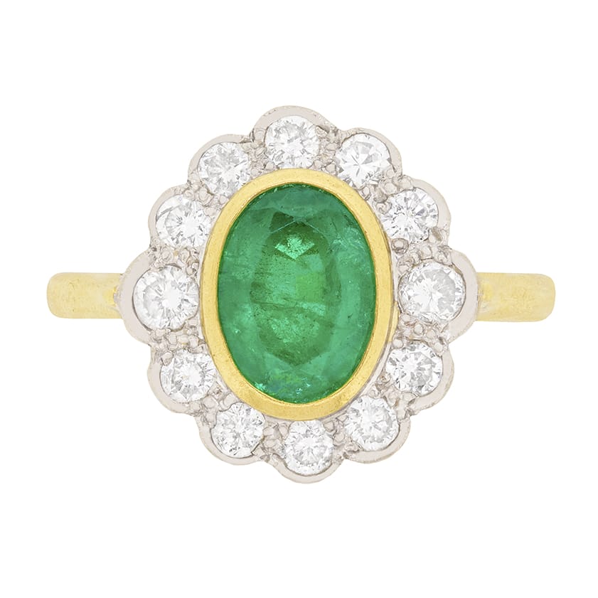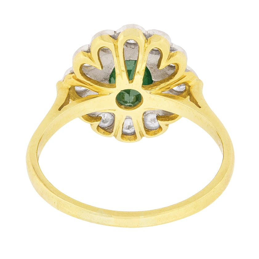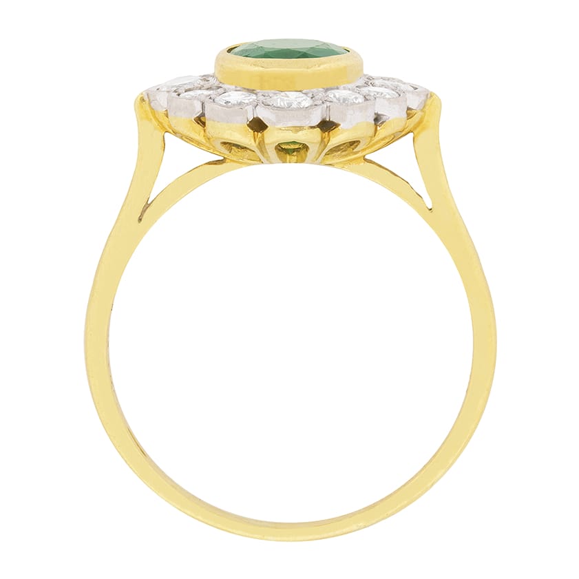 Dating to the 1950s, this beautiful cluster ring features a green emerald in the centre weighing 1.40 carat. It is a natural emerald which is haloed by sparkling white diamonds. The diamond, which are round brilliants, have a combined weight of 0.70 carat and are estimated F in colour and VS in clarity. The emerald has been rub over set using 18 carat yellow gold, whilst the diamonds are set within 18 carat white gold. The gallery work, which is open set, is also in 18 carat yellow gold.