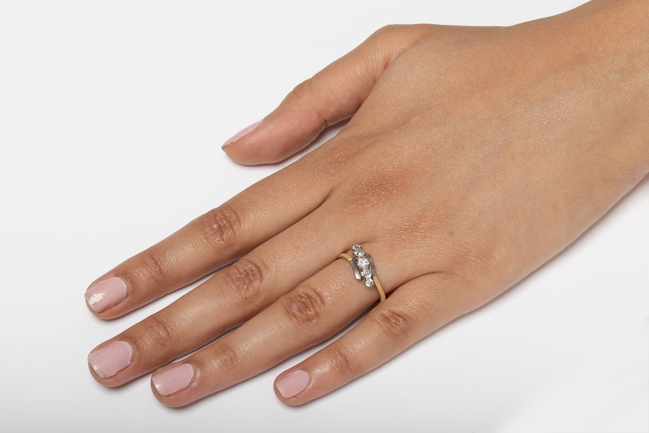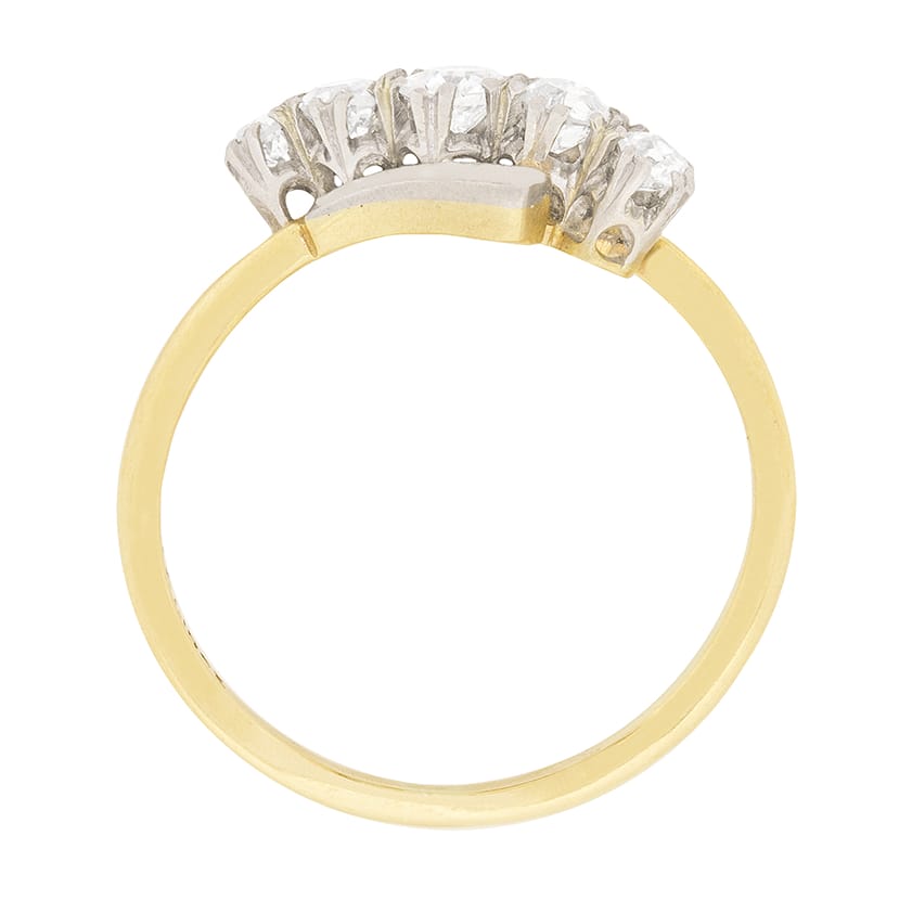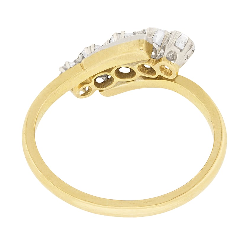 Five old cut diamonds that graduate outwardly in size from the centre stone are the focal point of this petite 1930s diamond ring. They have a total weight of 0.45 carat, and are H in colour, SI in clarity. The diamonds are claw set on the diagonal within pierced platinum galleries, and the balance of the ring’s vintage crossover setting is comprised of 18 carat yellow gold with platinum accents at its shoulders.