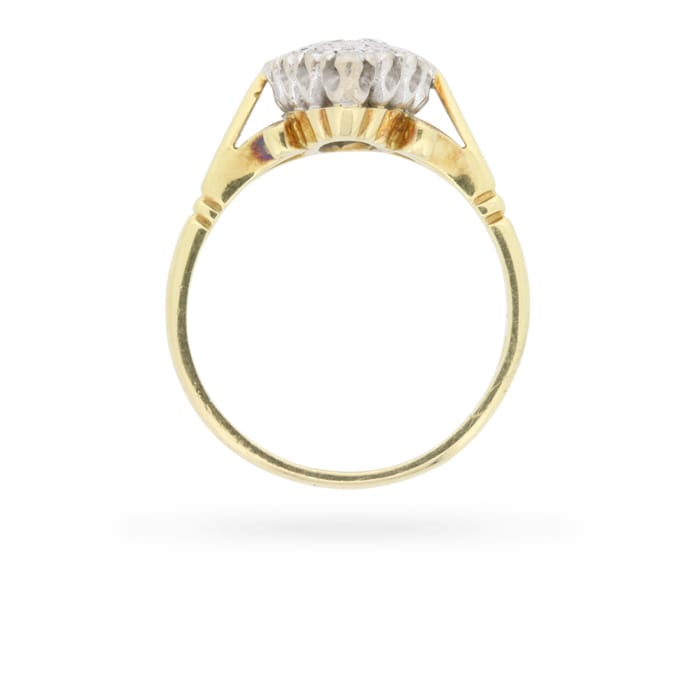 Circa 1976, this vintage diamond ring centres the largest of twenty-seven round brilliant cut diamonds amid a sparkling sea of diamonds of varying sizes, all in open back claw and grain mountings within an 18 carat white gold bezel. They are G in colour and VS in clarity, with a combined weight of 0.90 carat. Tri-split tapered and scrolling shoulders, and a fluted under-gallery add extra panache in 18 carat yellow gold.
