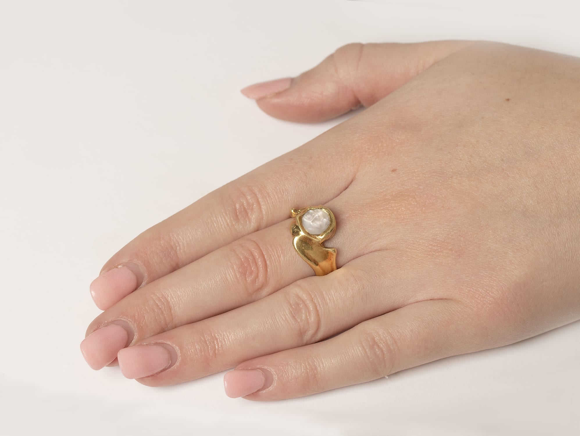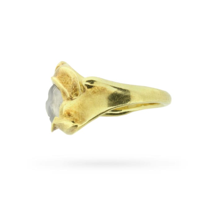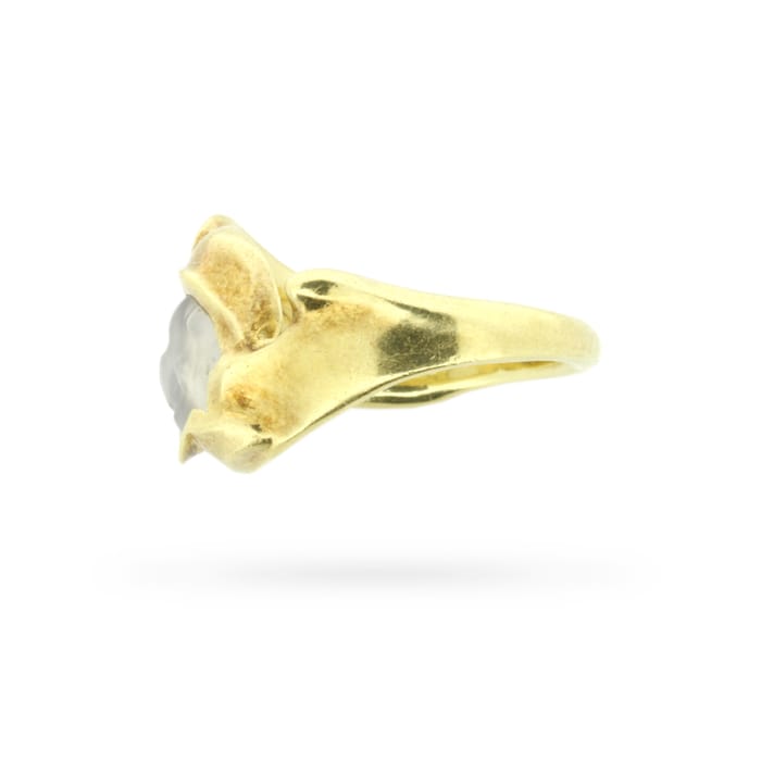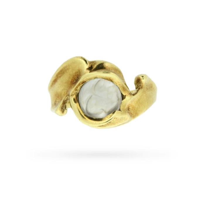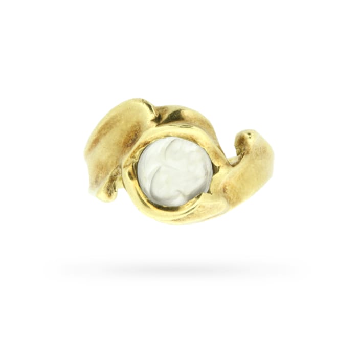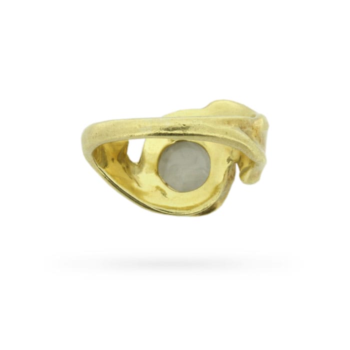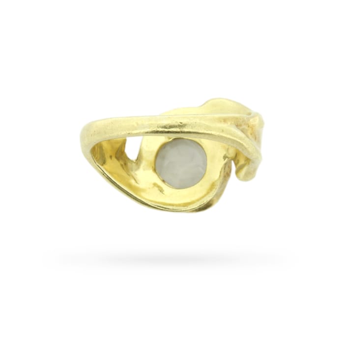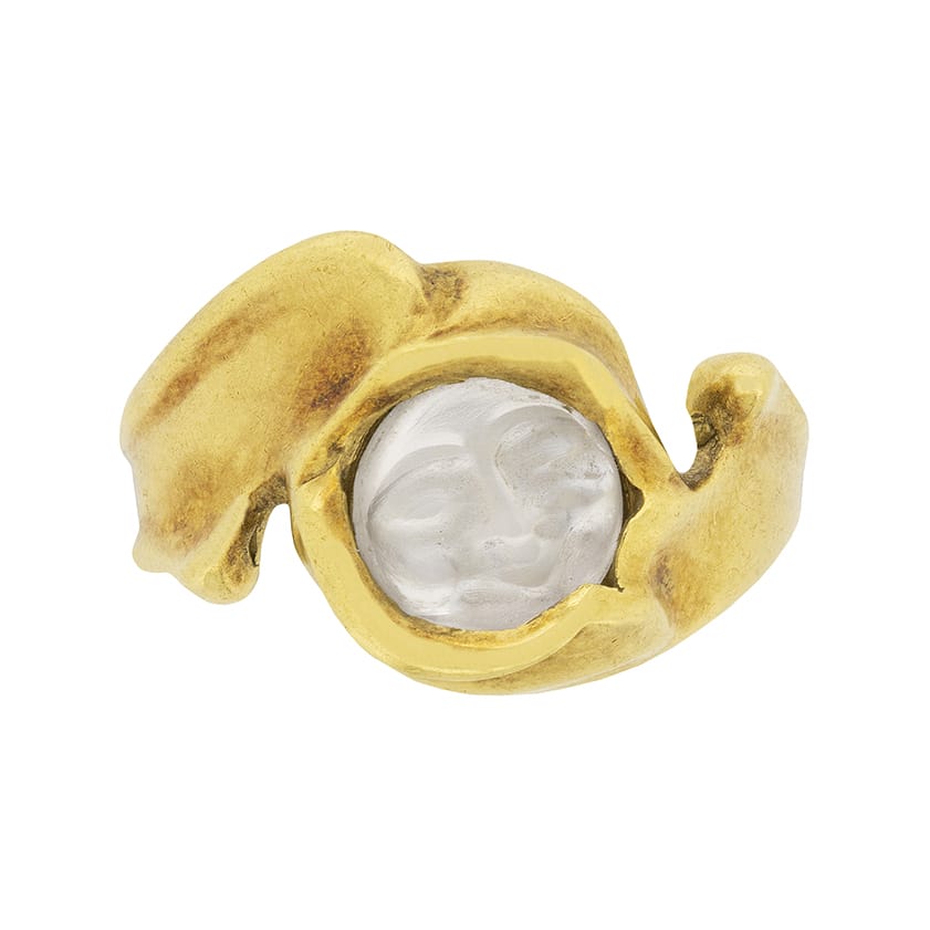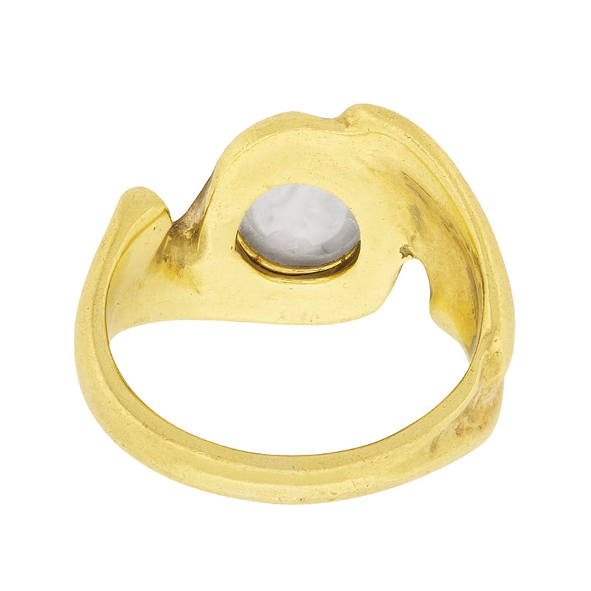 A luminous round moonstone glows at the centre of this vintage freeform circa 1970s statement ring. This celestial ring was handcrafted in 18 carat yellow gold in an abstract design as far out as the decade that spawned it.