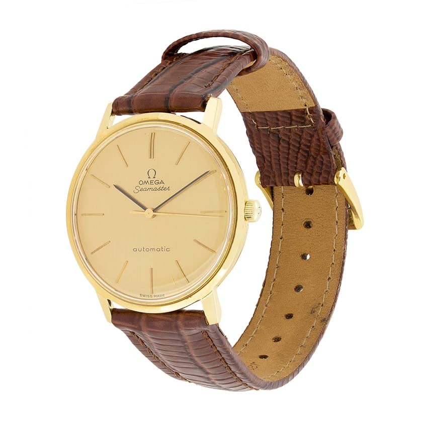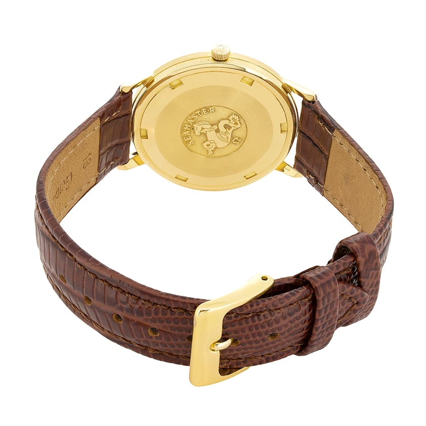 Coming with it’s original box and papers, this vintage Omega Seamaster is beautifully presented. This dress watch features 18 carat yellow gold case and face with a brown leather strap. Chevron markings denote the hours with a double at the 12. The omega logo sits just below the 12 for a minimal and timeless design.