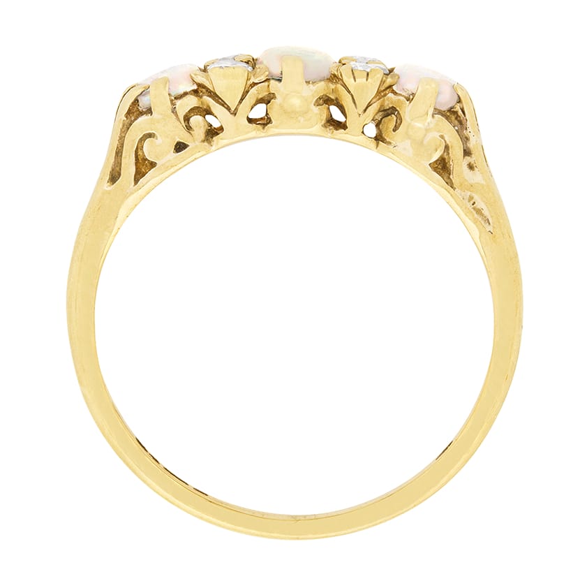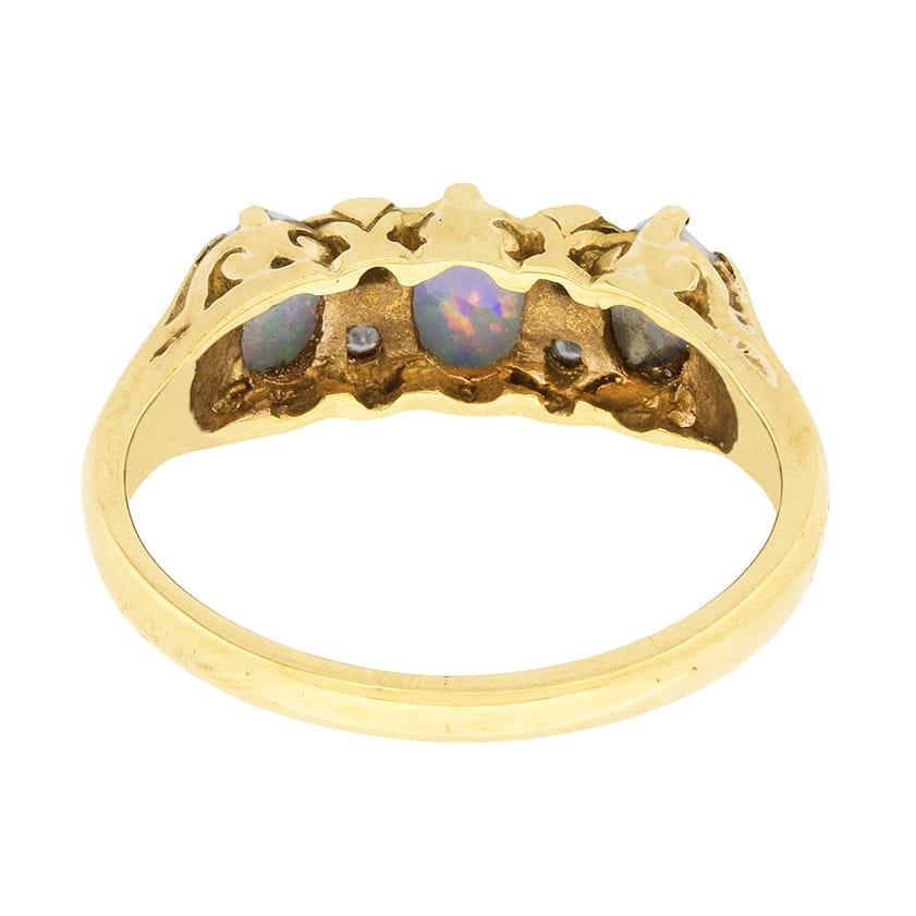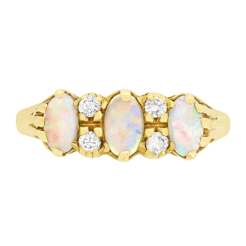 A vintage dress ring from the 1980s, featuring three opals with a combined weight of 0.60 carat. They are natural opals with a strong colour running through them. There are four small diamonds set around the centre opal with a total weight of 0.08 carat. The setting work has been cast from 9 carat yellow gold.
