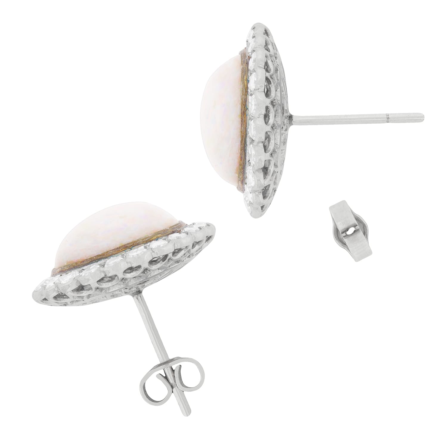 These wonderful earrings feature opals in the centre which are a beautiful colour. They each weigh 2.70 carat, whilst the diamonds encircling them have a combined weight of 1.10 carat in each earring. The diamonds are eight cuts, and are estimated to be G in colour and VS in clarity. The metal is platinum and the detailed filigree work on the back of the earrings is a sign of the craftsmanship. They come with butterfly backs also made of platinum.