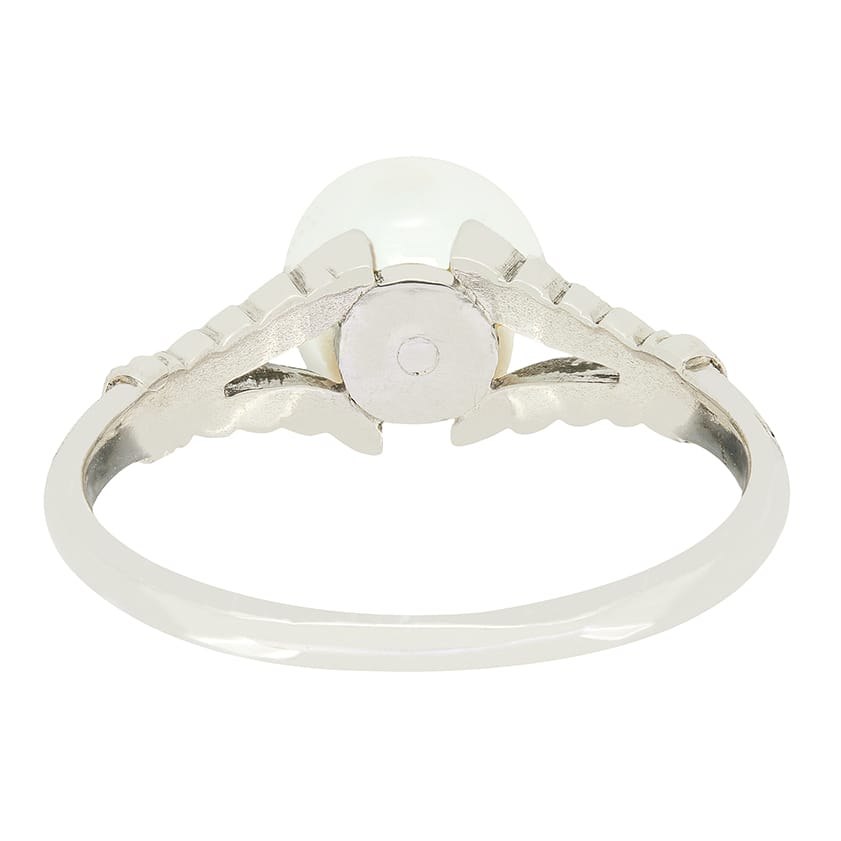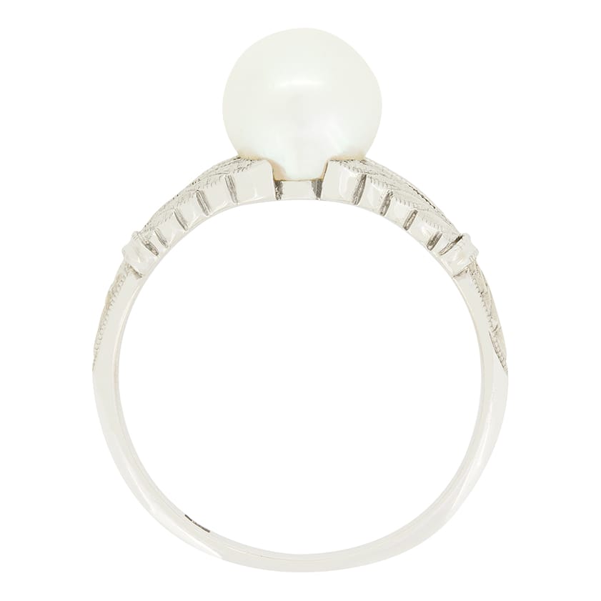 Dating to the 1950s comes this delightful pearl ring. Sitting proud at the centre a single cultured pearl is set in platinum. Hand carved decoration adorns the split shoulders flowing down from the pearl, leading into a simple band.