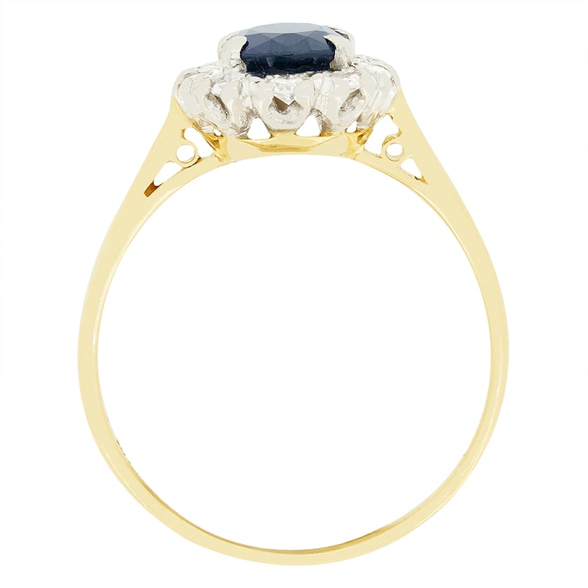A deep blue sapphire sits central to this wonderful cluster ring hallmarked 1962. The oval cut stone weighs 0.80 carat and is expertly claw set into platinum. Surrounding the sapphire a halo of eight diamonds sparkle. Totalling 0.30 carat, the diamonds match colour at G and range in clarity from VS to SI. The platinum head sits upon a band of contrasting 18 carat yellow gold, the mix of metals complementing blue of the sapphire beautifully.