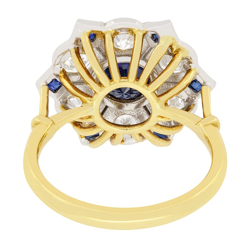 The Vintage style cluster ring features a 1.18 carat central round sapphire, rub over set in 18 carat yellow gold. Surrounding this Sapphire is a total of 2.10 carat of round brilliant cut diamonds, 0.35 carats each for the six diamonds. Further embellishing the head of the piece are six additional square sapphires, each weighing 0.10 carats. Both the diamonds and sapphires are elegantly set in platinum with milgrain detailing. The intricate design is finished with basket work and band crafted from 18 carat yellow gold.