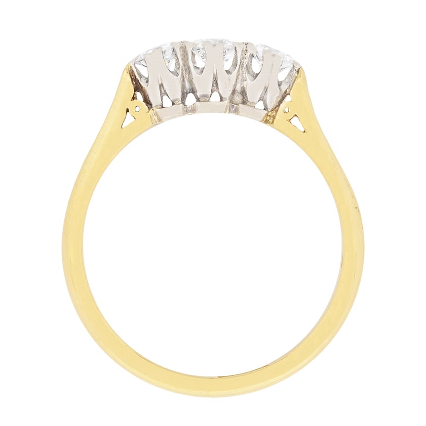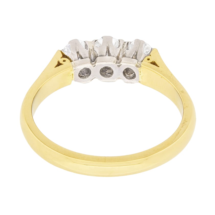 This beautiful vintage three stone ring has a 0.20 carat diamond in the centre and adjacent are two 0.15 carat diamonds. They are round brilliant diamonds and estimated as H in colour and VS1 in clarity. The collets are made in 18 carat white gold, whilst the shank has been cast in 18 carat yellow gold. The ring dates to the 1950s and is an ideal engagement ring.