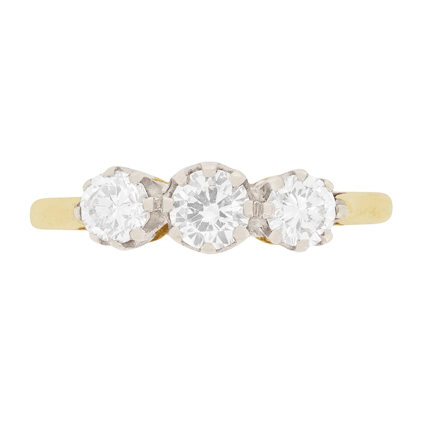This classic three stone ring has three round brilliant diamonds set within 9 carat white gold. The centre diamond weighs 0.35 carat whilst the two adjacent weigh 0.25 carat each. They are estimated as G in colour and VS1 in clarity. The band is in 9 carat yellow gold and the ring dates to around the 1950s.